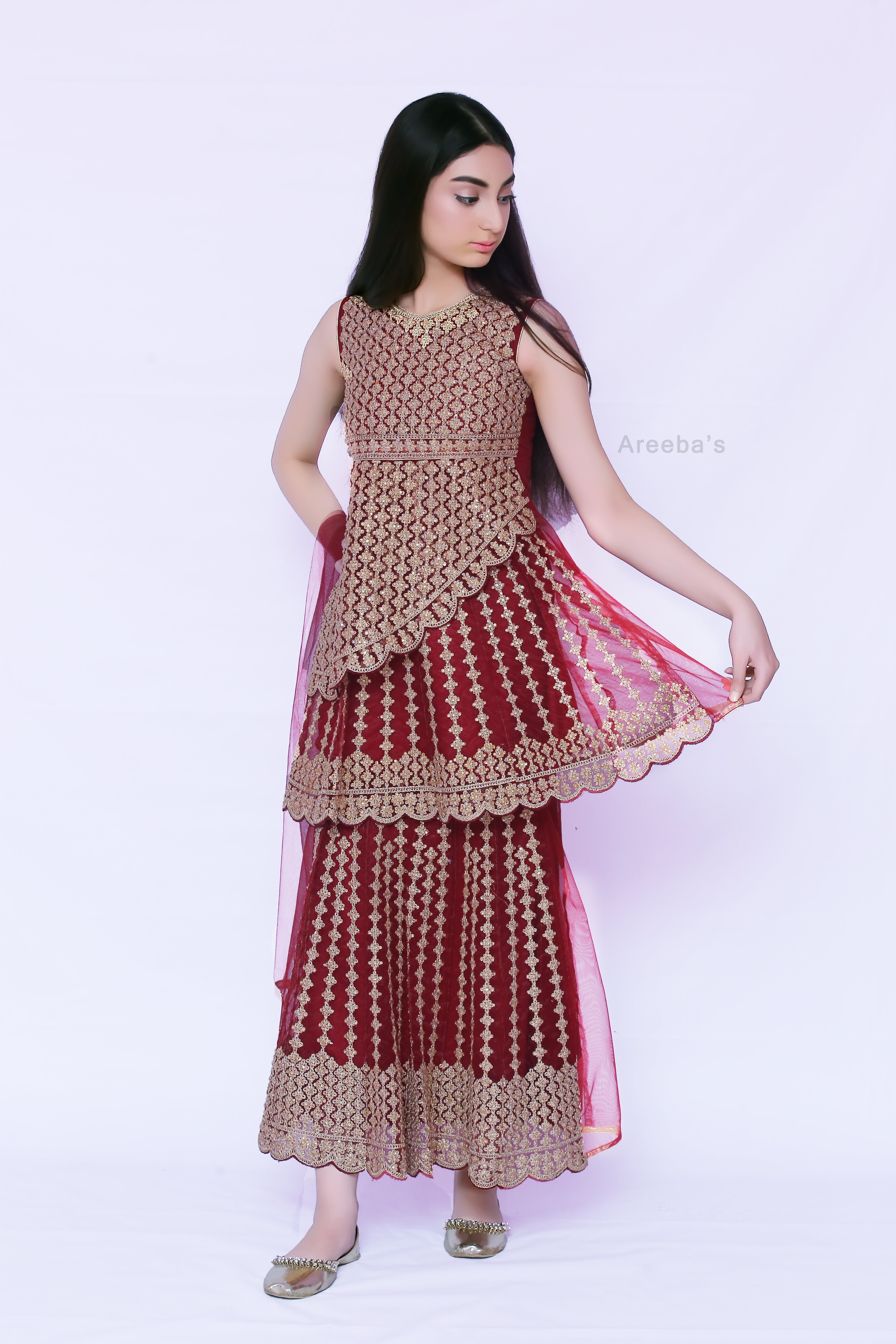 Girls red Shahjahan Garara collection D1 - This ensemble features a beautiful shirt with handwork embroidery and gem work