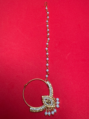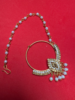 Beautiful nose ring for Indian/ Pakistani bride . the nose ring set is embellished with pearls and gold beads. It's a stunning looking nath. Ideal for weddings . Unique design. Handmade item.