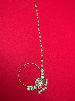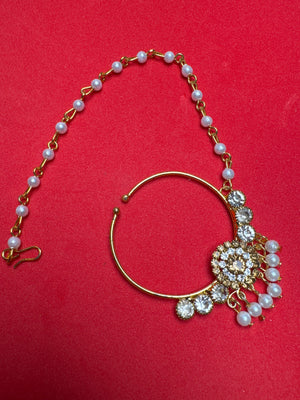 Beautiful nose ring for Indian/ Pakistani bride . the nose ring set is embellished with pearls and gold beads. It's a stunning looking nath. Ideal for weddings . Unique design. Handmade item.