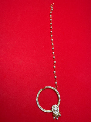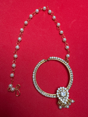 Beautiful nose ring for Indian/ Pakistani bride . the nose ring set is embellished with pearls and gold beads. It's a stunning looking nath. Ideal for weddings . Unique design. Handmade item.