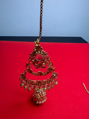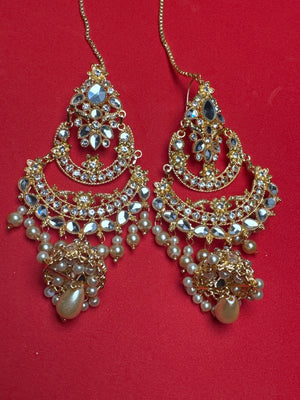 Beautiful earrings and Tikka set. A must have item for your jewellery collection. Stunning looking and attractive pair of Pakistani Earrings. The stylish shape earrings studded with sparkling white colour stones and beads all over are surely the glittering and dazzling fashion accessories.