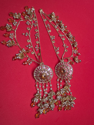 Beautiful earrings and Tikka set. A must have item for your jewellery collection. Stunning looking and attractive pair of Pakistani Earrings. The stylish shape earrings studded with sparkling white colour stones and beads all over are surely the glittering and dazzling fashion accessories.