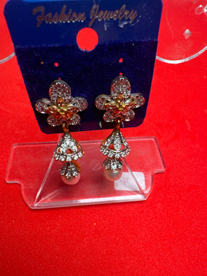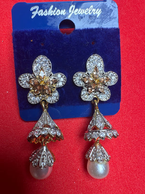 Beautiful earrings. A must have item for your jewellery collection. Stunning looking and attractive pair of Pakistani Earrings. The stylish shape earrings studded with sparkling white colour stones and beads all over are surely the glittering and dazzling fashion accessories.
