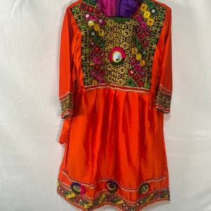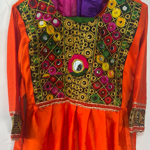 This Afghan Frock is made from luxurious silk detailed with exquisite Afghan embroidery on the gala daman sleeves. The three piece include a trouser, making it perfect for festive occasions.
