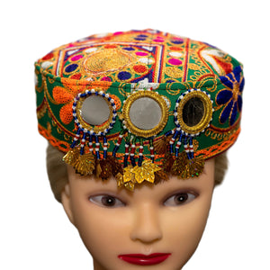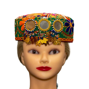 Afghan Hat 23 - Vibrant Green Embroidered Cultural Hat with Gold Mirrors and Beads for Traditional Fashion