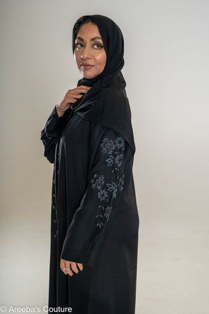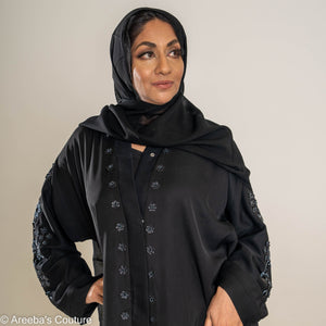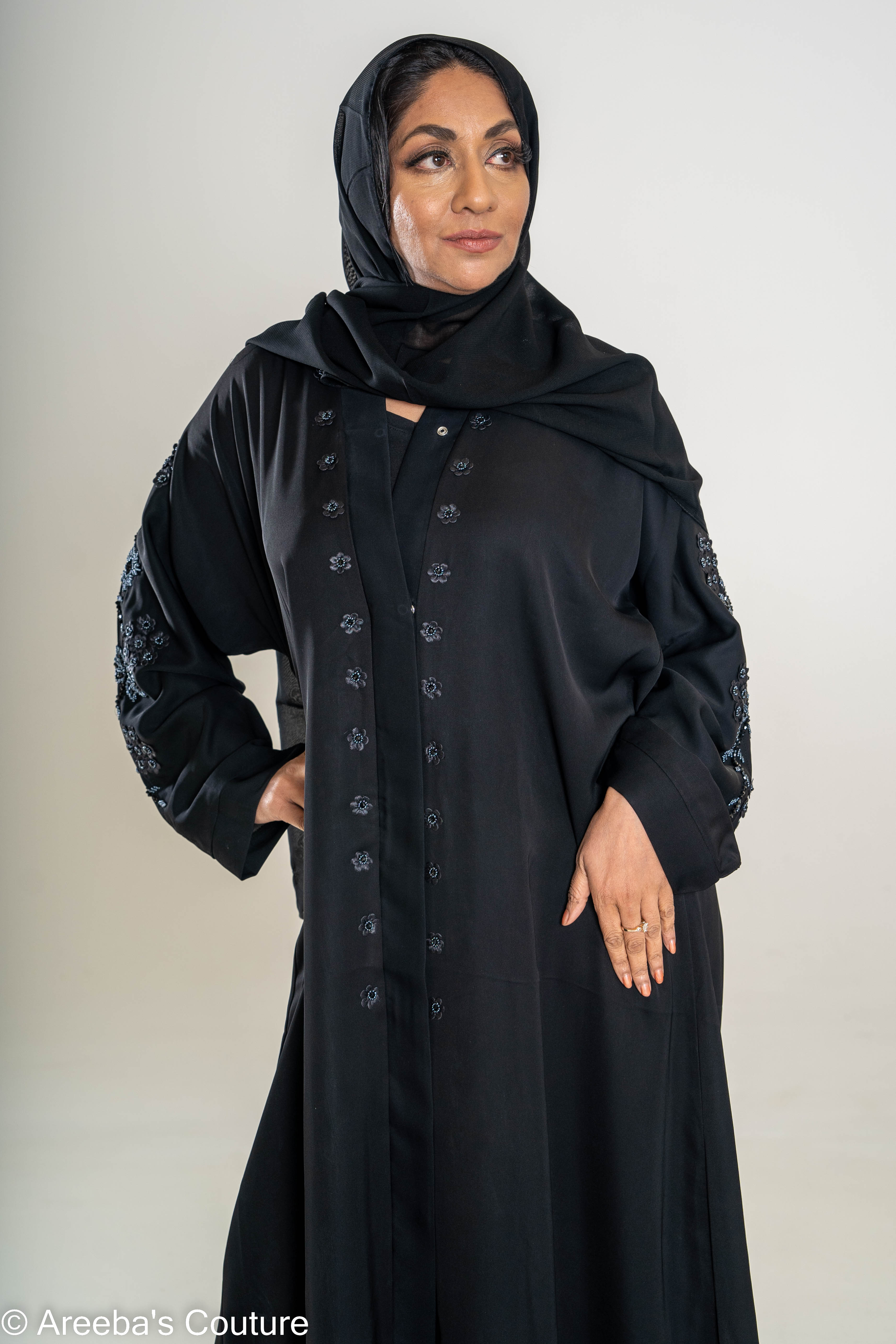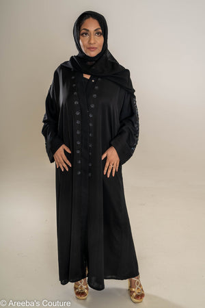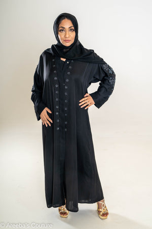 Areeba's Couture Black on Black Cut Dana Abaya - High-Quality Fabric with Elegant Black Dana Detailing for Timeless Style