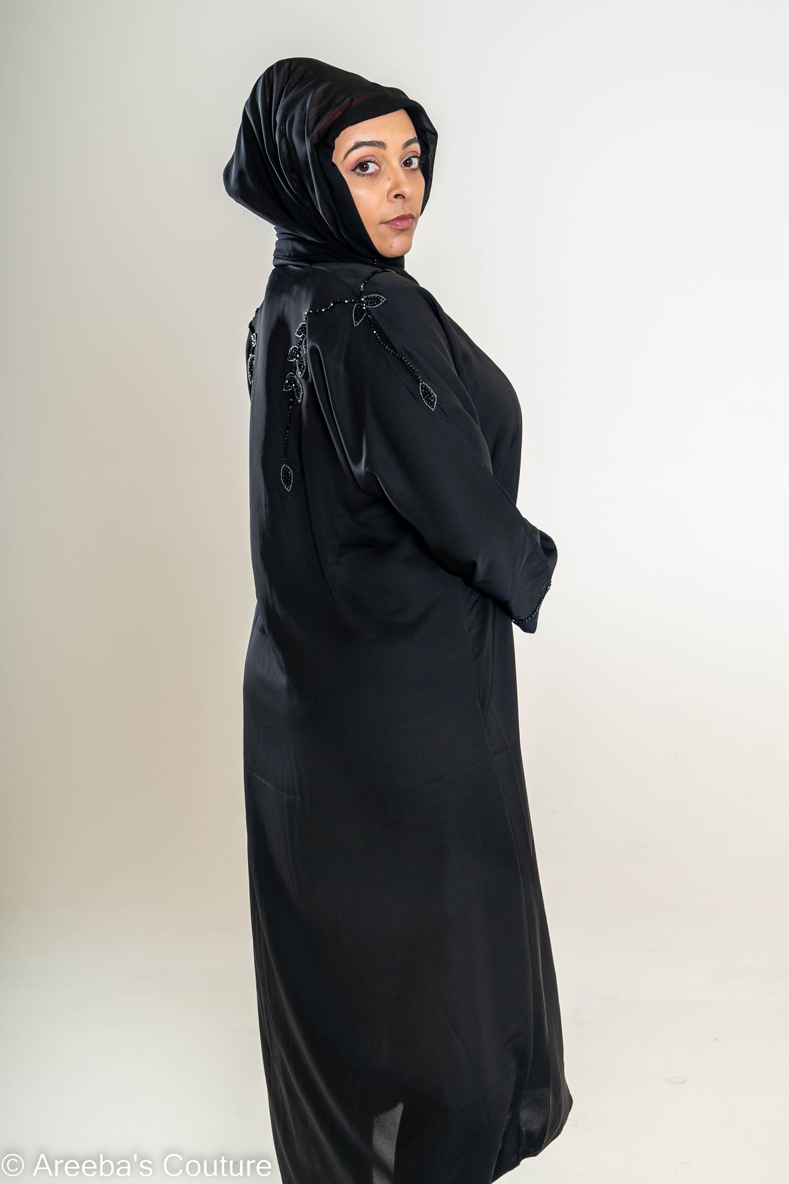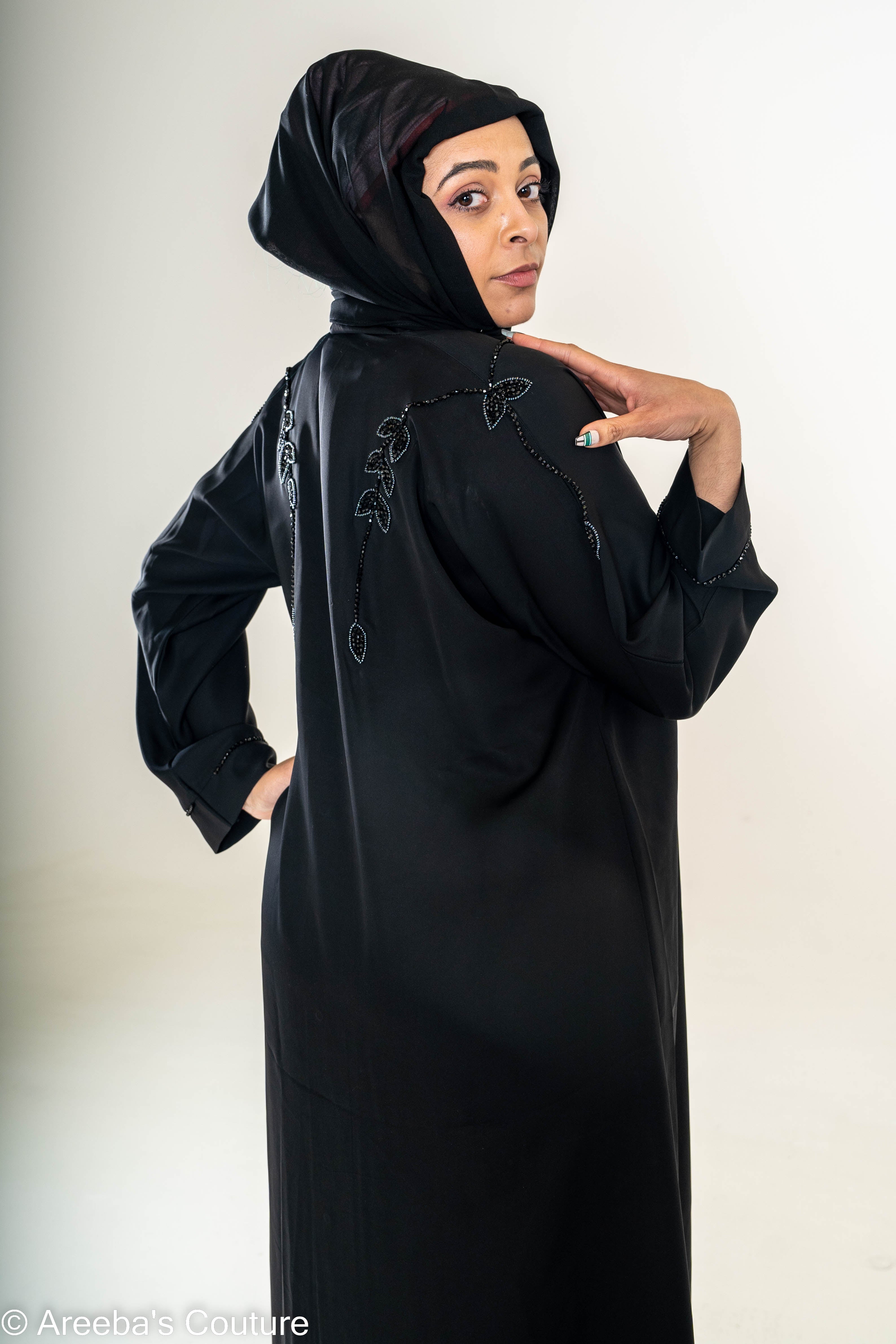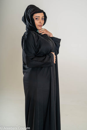 Areeba's Couture Black on Grey Cut Dana Abaya with Elegant Embroidery and Hooded Design