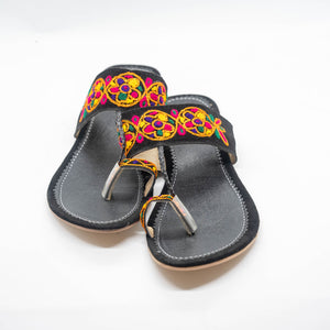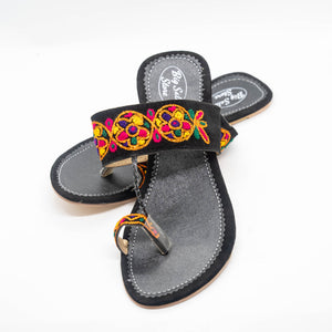 Step into daring adventure with our Black Sindhi embroidered kolapuri chapal. Add a touch of boldness to any outfit with intricate embroidery and stylish design. Experience the thrill of taking risks and standing out from the crowd. Get yours now!