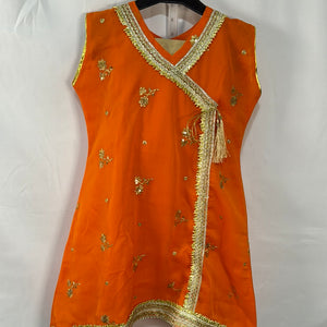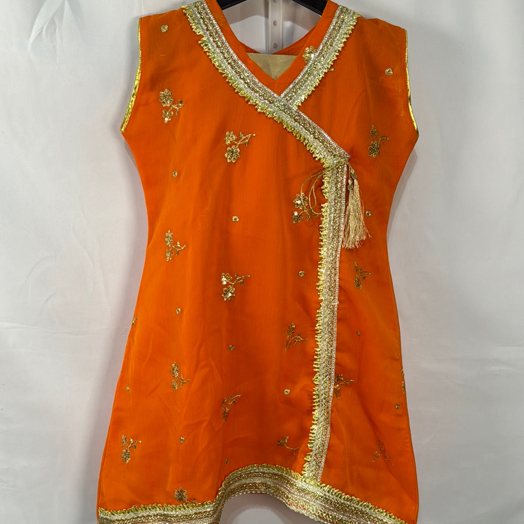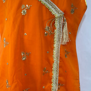 Girls chiffon outfit for any occasion , embroidery on shirt with gold lace and plain golds trouser and net scarf