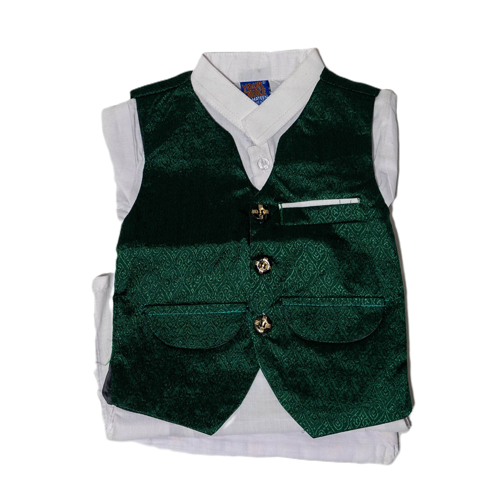 Expertly crafted from soft and breathable cotton, this boys white shalwar suit is the perfect choice for formal occasions. The green waistcoat adds a touch of color and style to the ensemble. Keep your little one comfortable and stylish with this classic suit.
