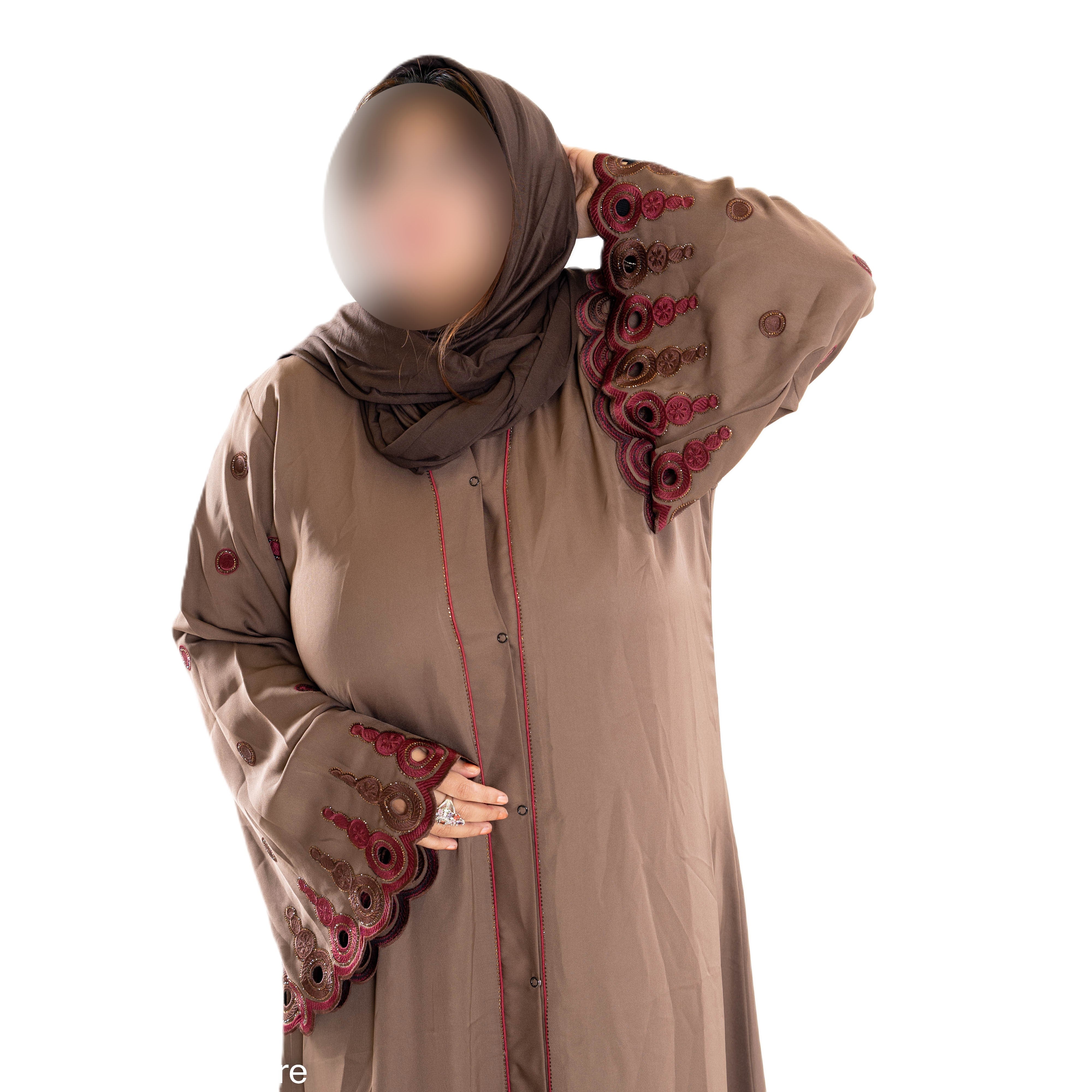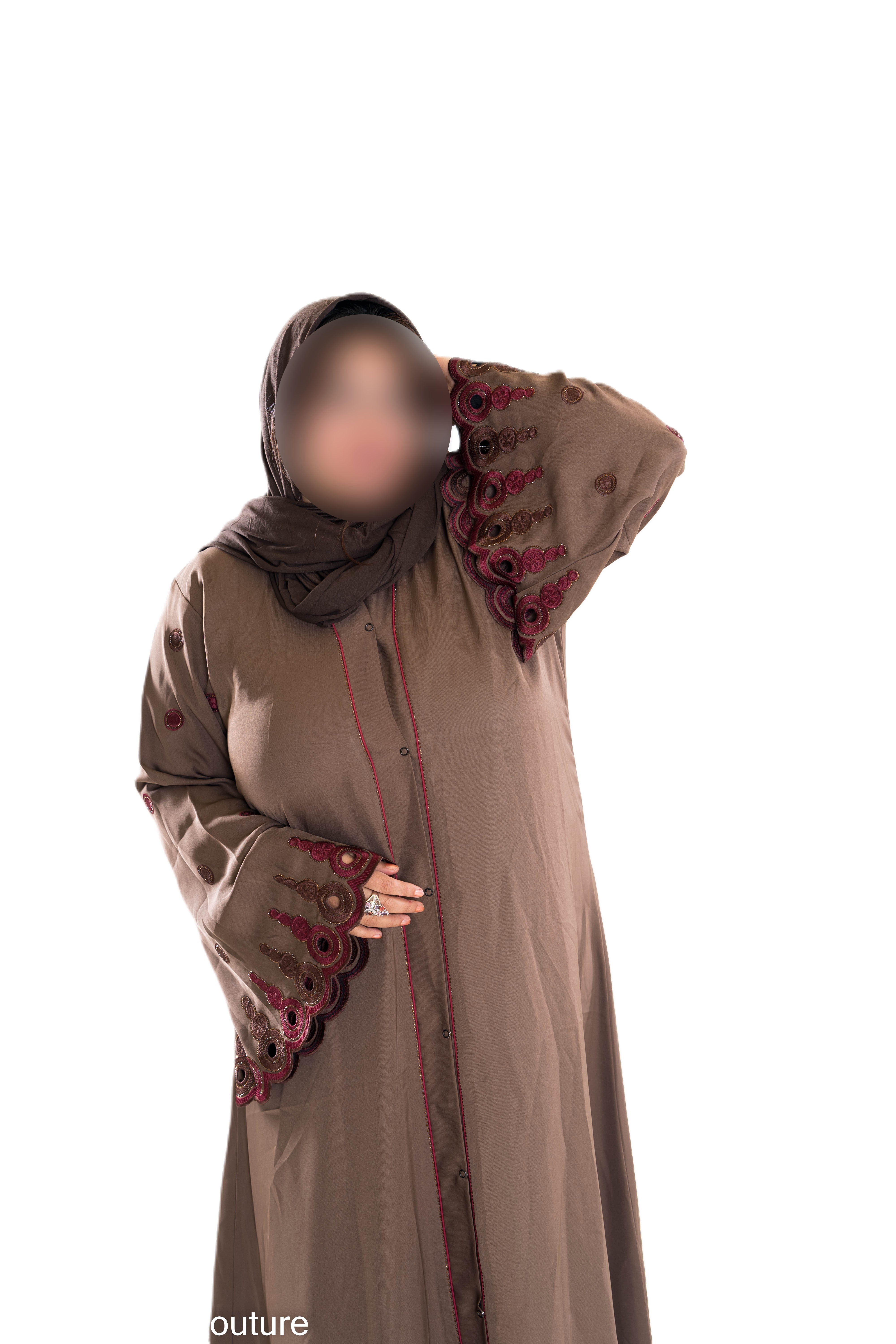 This Coloured embroidered sleeves abaya features intricately designed and richly colored sleeves, adding a unique touch to the traditional garment. Perfect for those looking to stand out in a crowd while still maintaining modesty. Made from high-quality materials, this abaya is both stylish and durable.