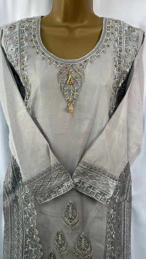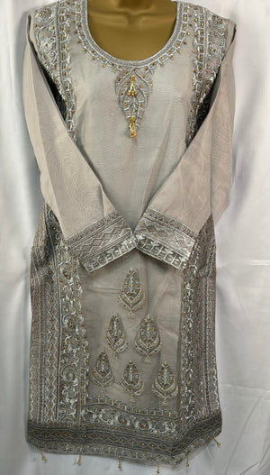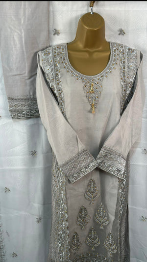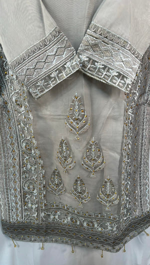 Three piece soft cotton oranza suit with embroidery on shirt and Dupptta , plain trouse with patch , is a lightweight outfit perfect for any occasion