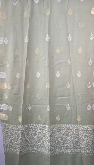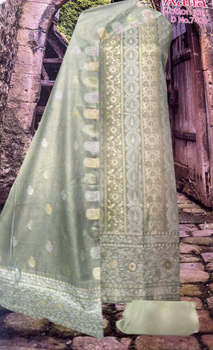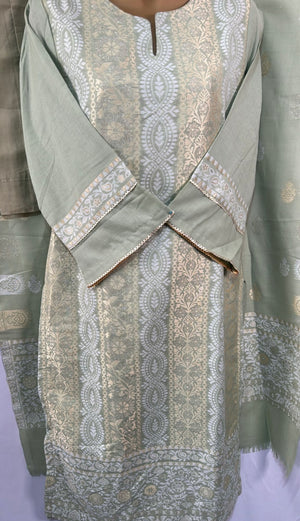 Cotton Zari three piece suit , comes with attached lining , and available in different colours , perfect for any occasion