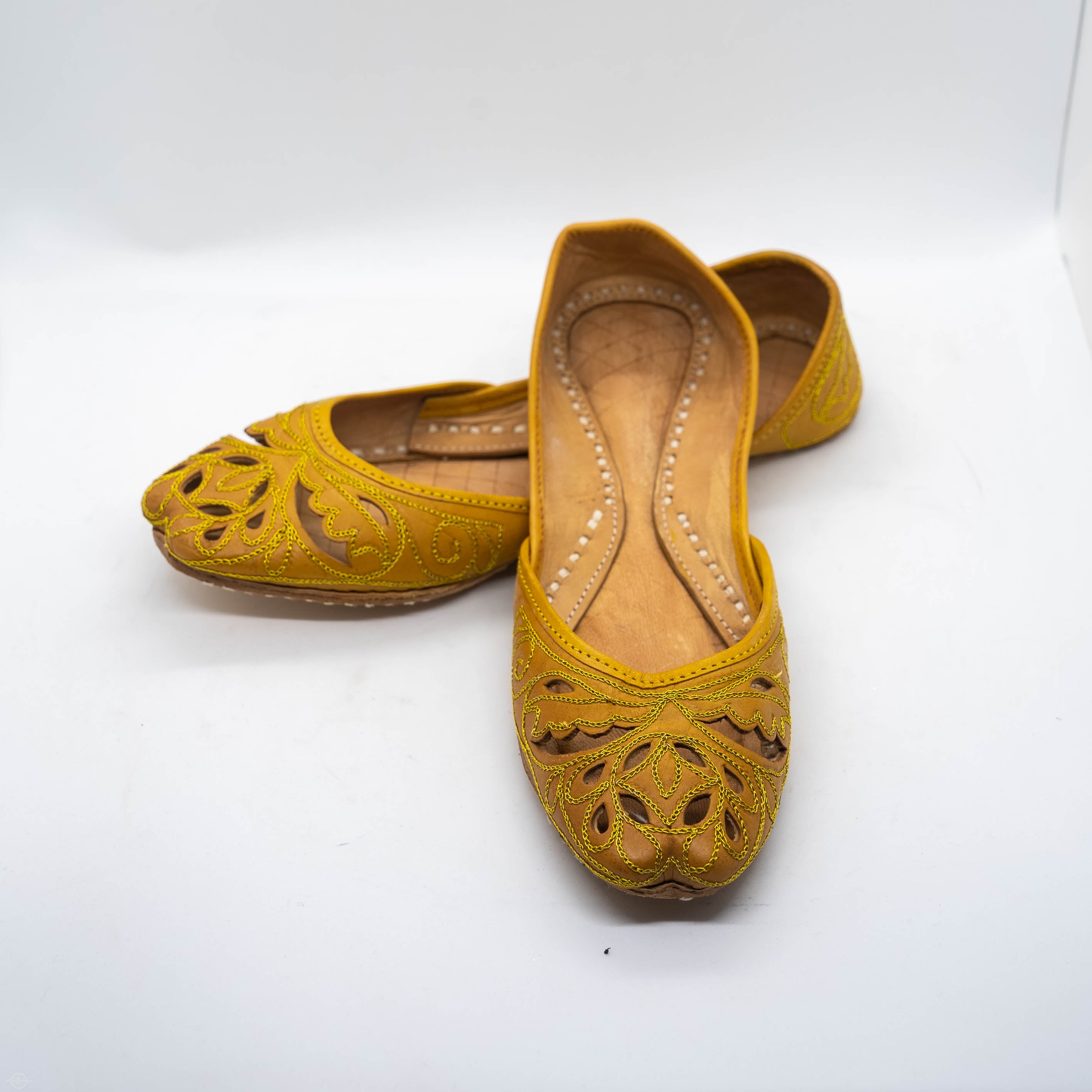 Slip into style with these CUTWORK KHUSSA YELLOW shoes. Featuring unique cutwork detailing, they add a touch of whimsy to any outfit. Perfect for a casual day out or dressing up for a special occasion. Step out in these playful and quirky shoes today!