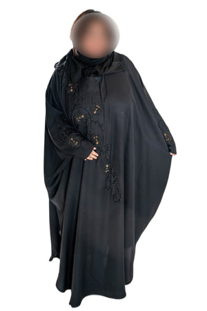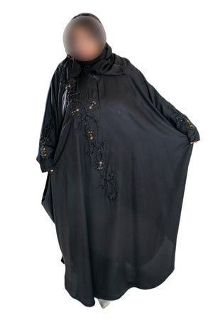 Embroidered and rose gold pearls on black abaya