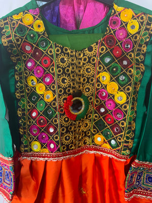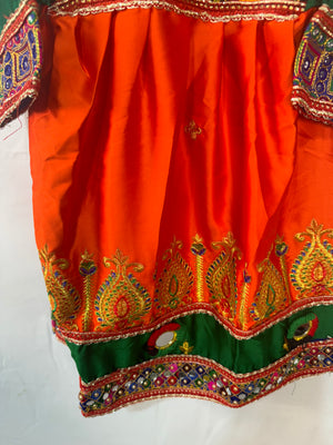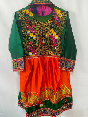 Girls Afghan Green Orange Dress with Embroidered Details and Peacock Motifs