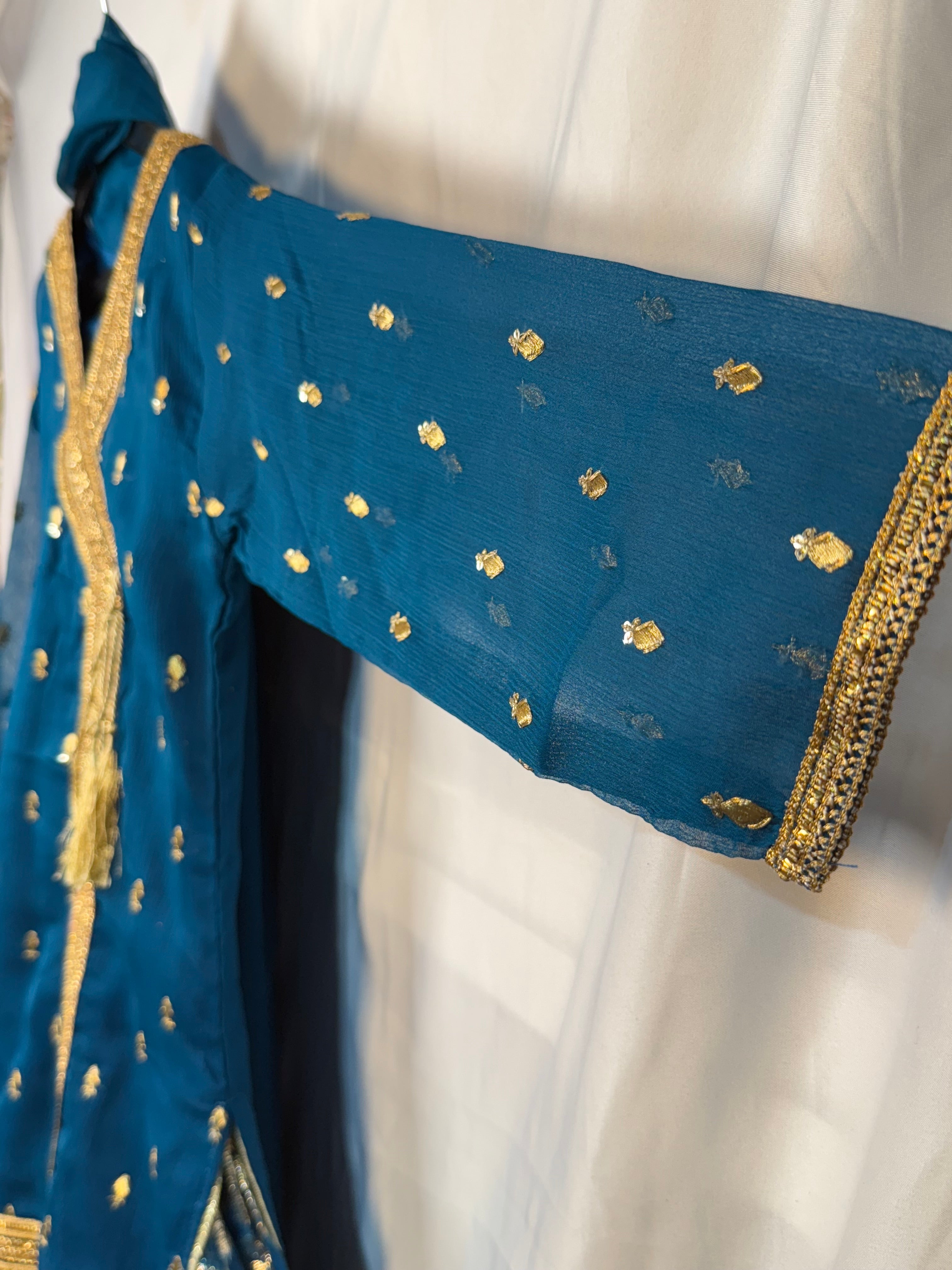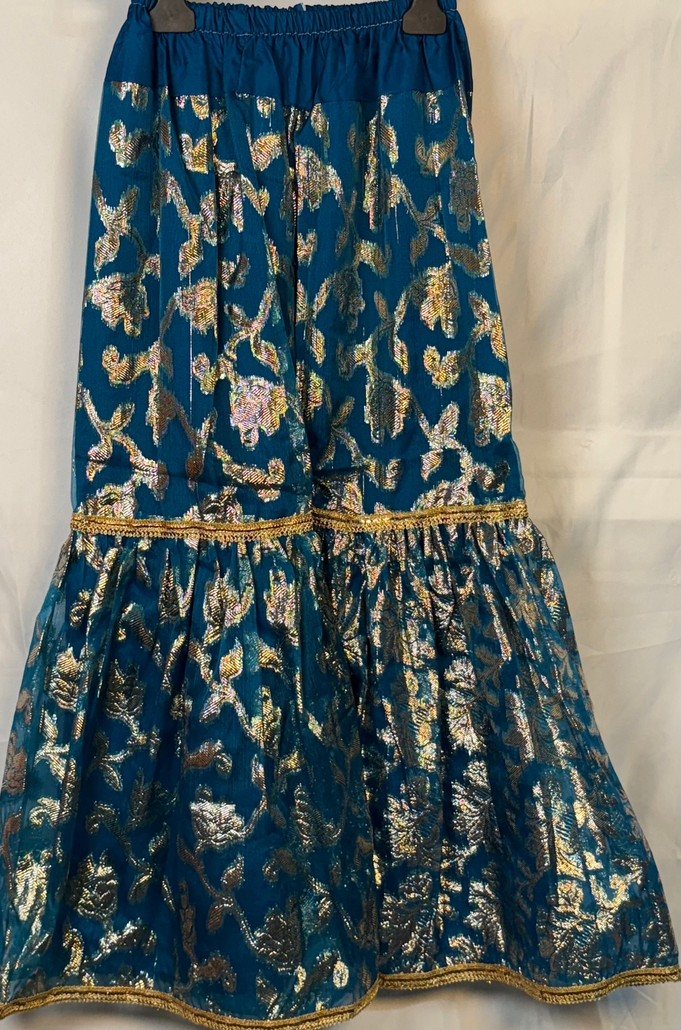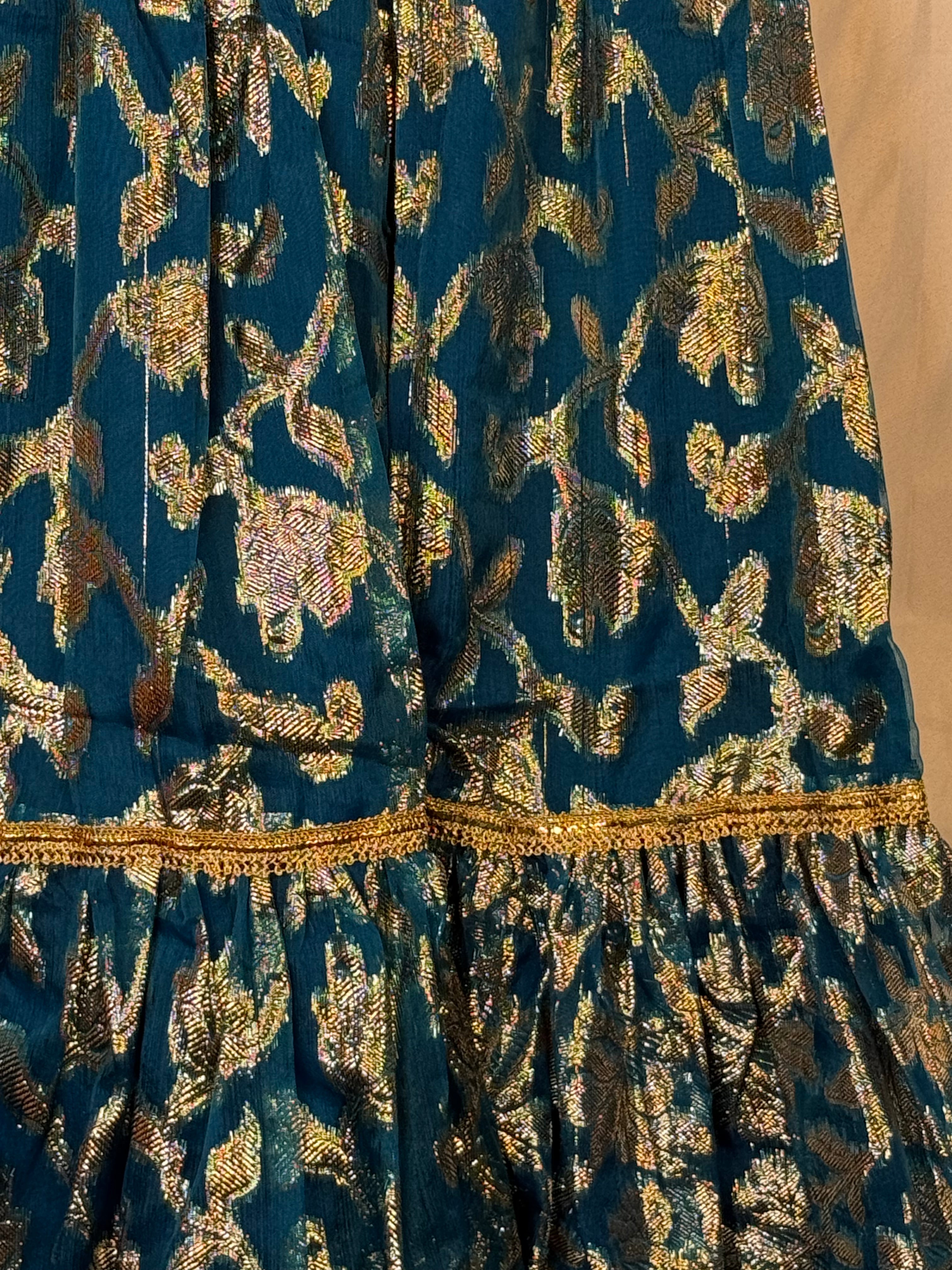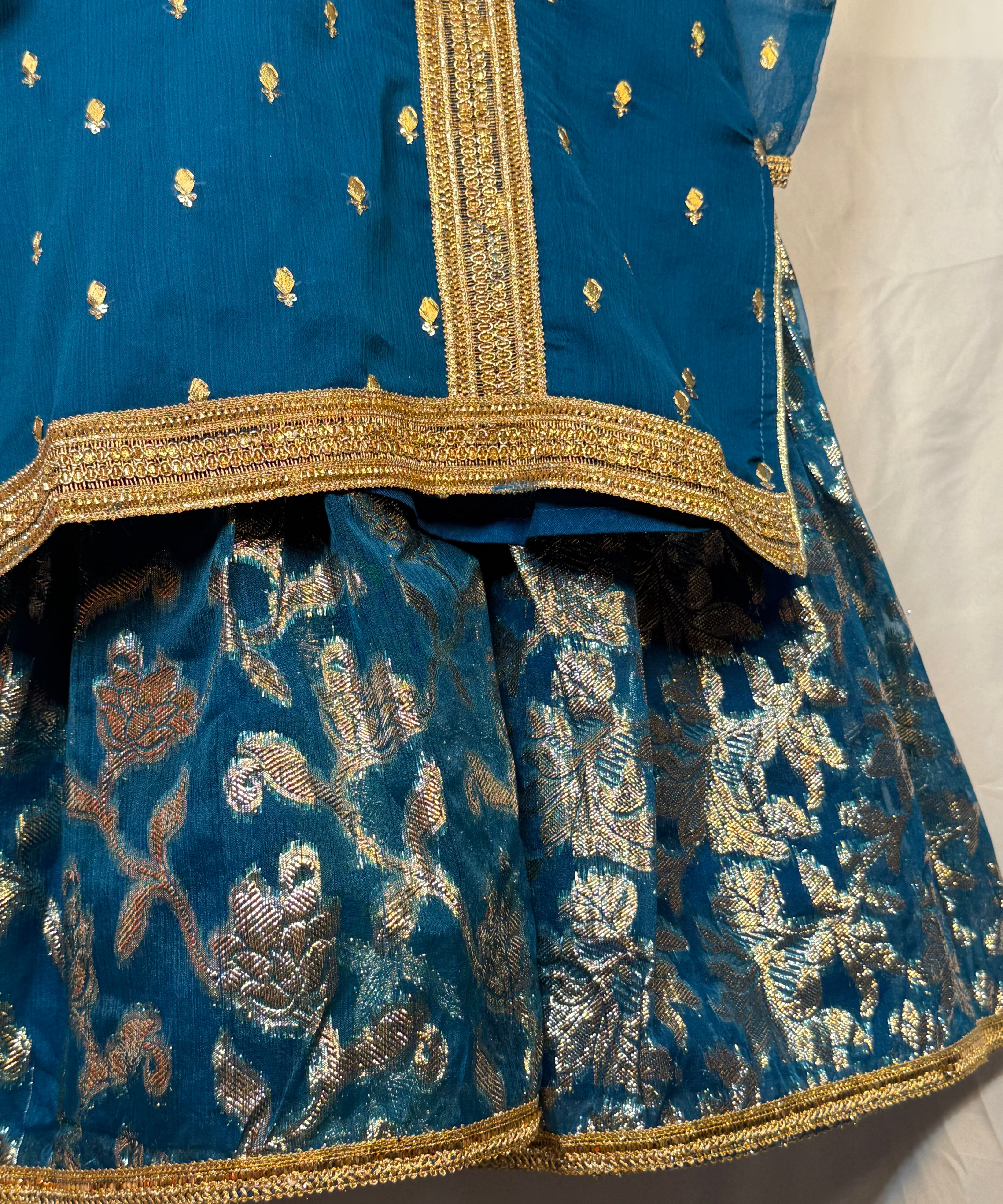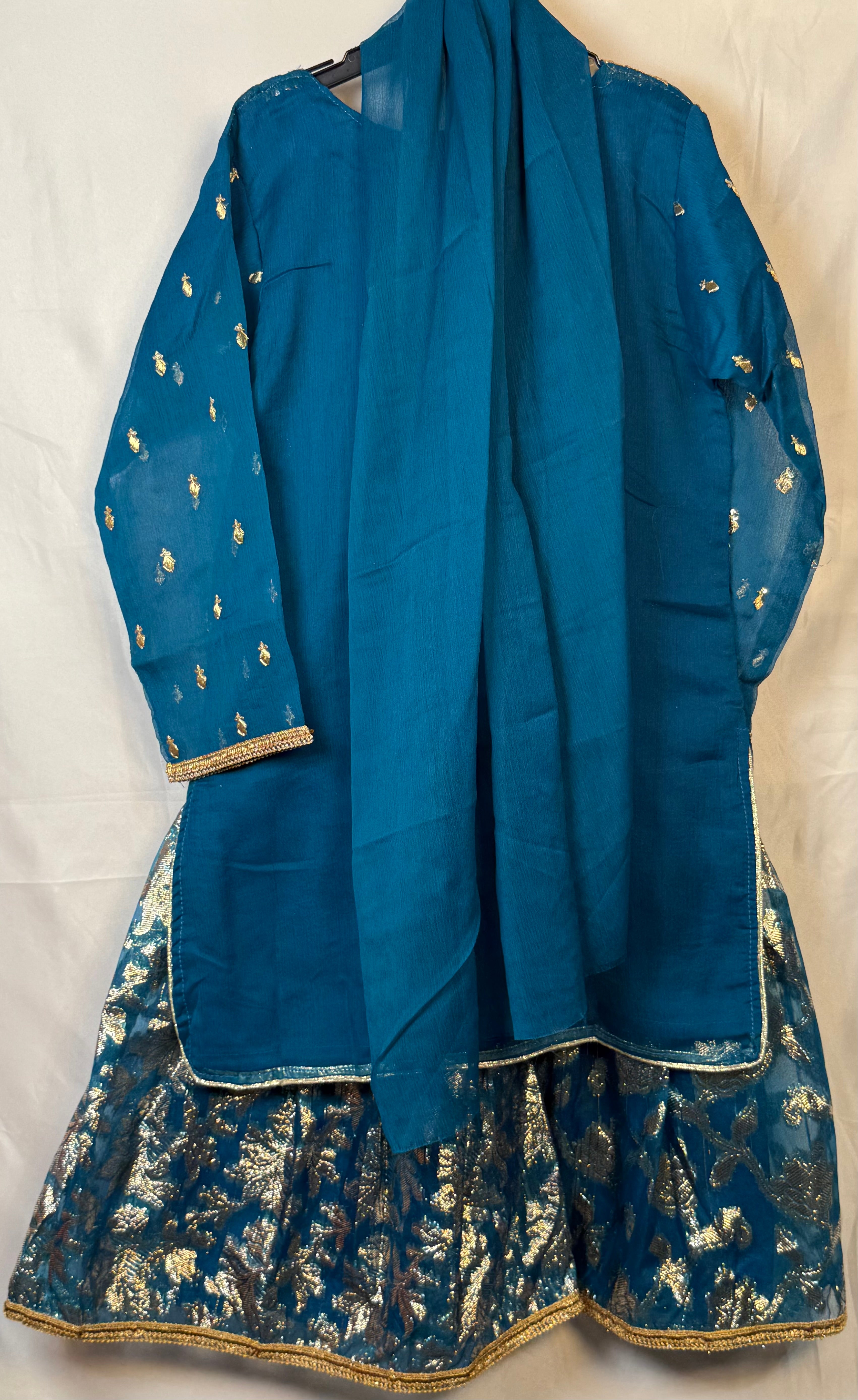 Girls Teal Blue Chiffon Angrakah Style Shirt & Garara Set With Emobidary On Shirt (3 Piece) Gcgs-9