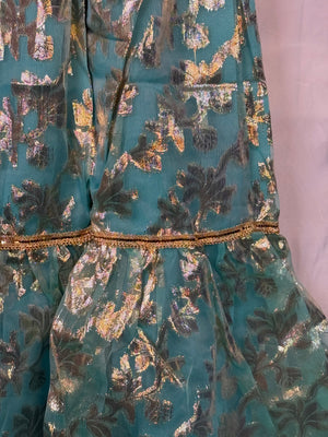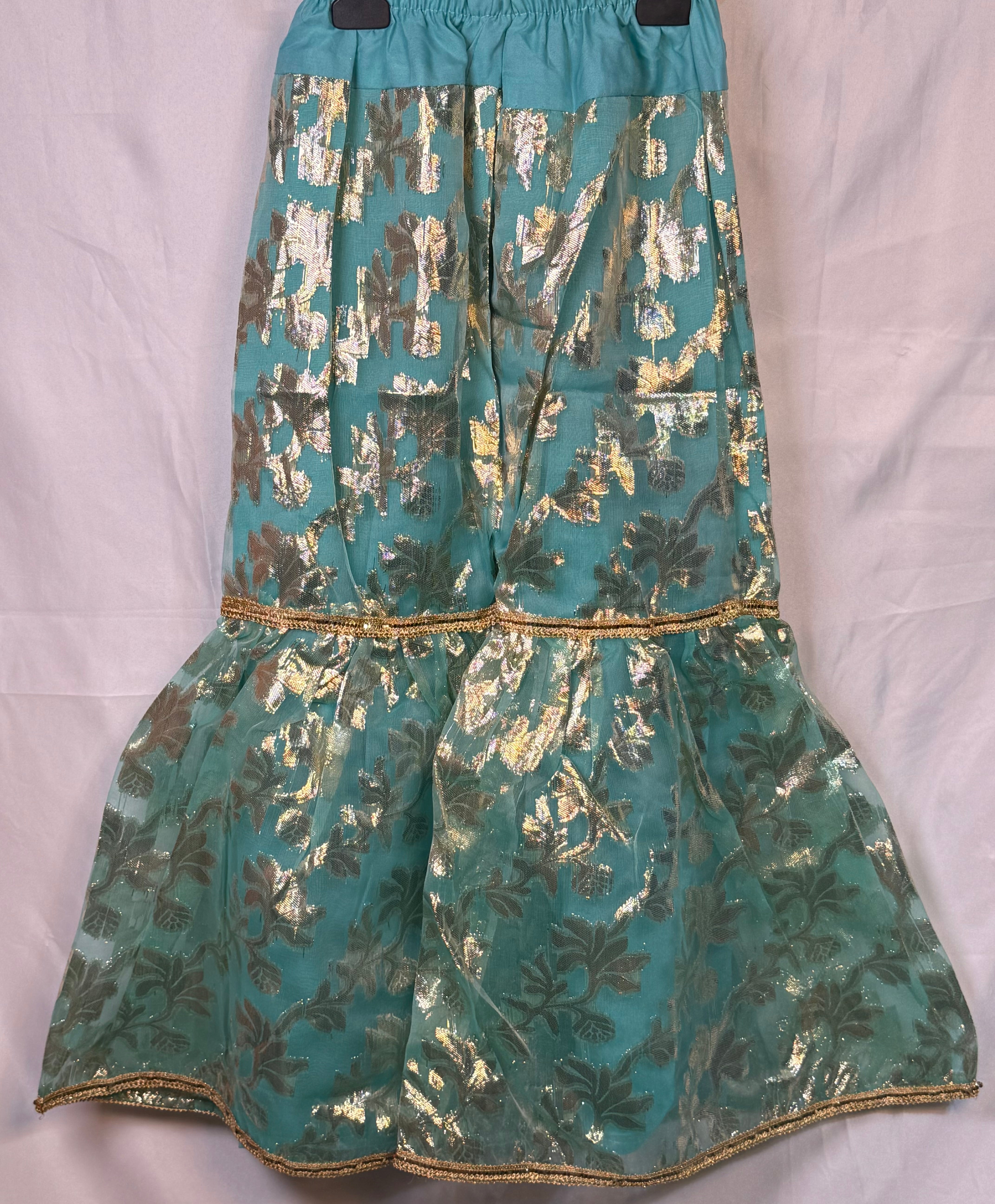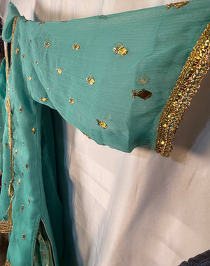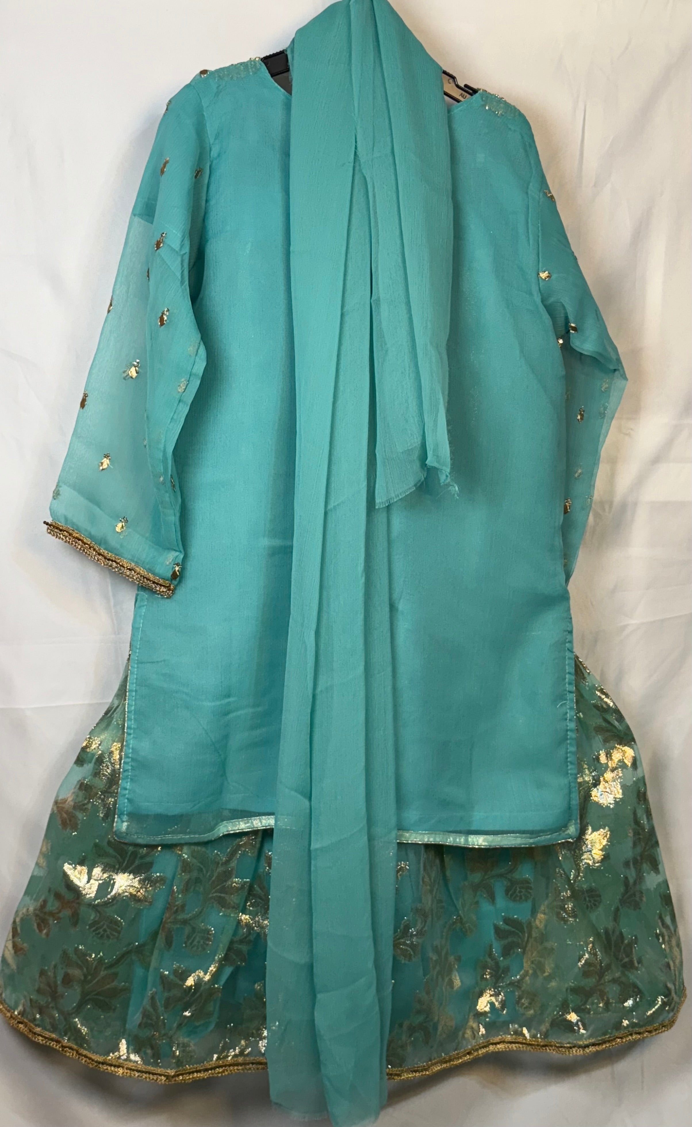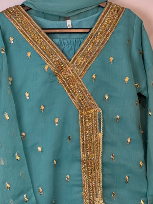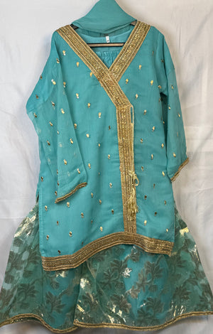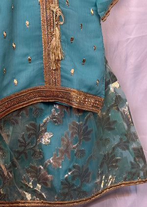 Girls Ferozi Chiffon Angrakah Style Shirt & Garara Set With Emobidary On Shirt (3 Piece) Gcgs-11