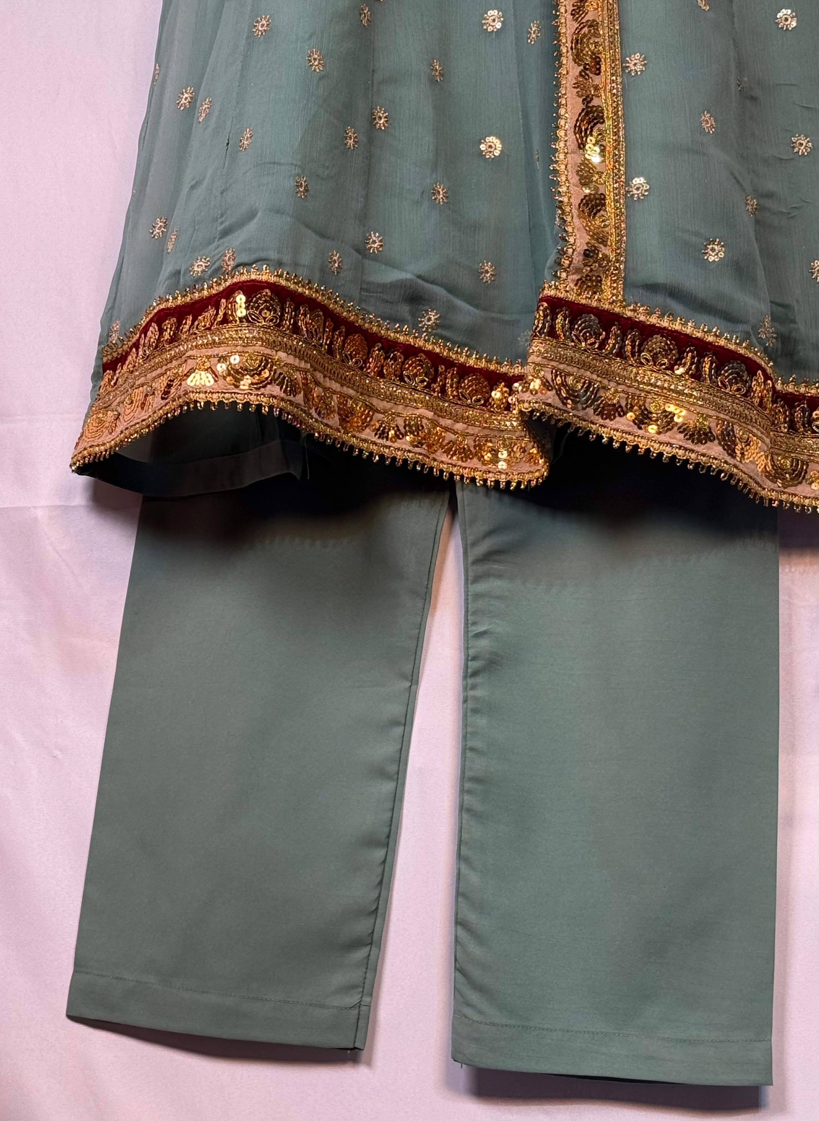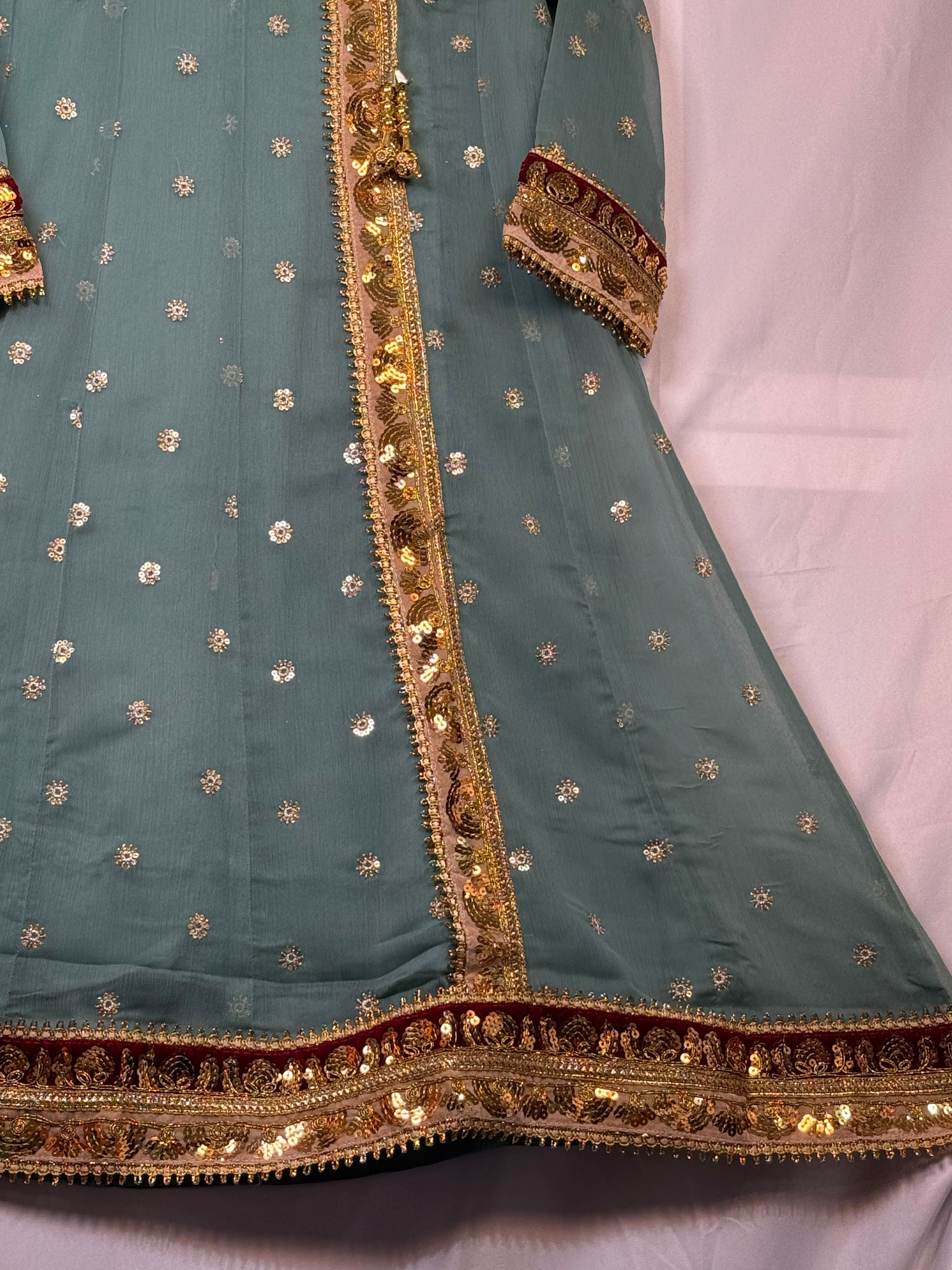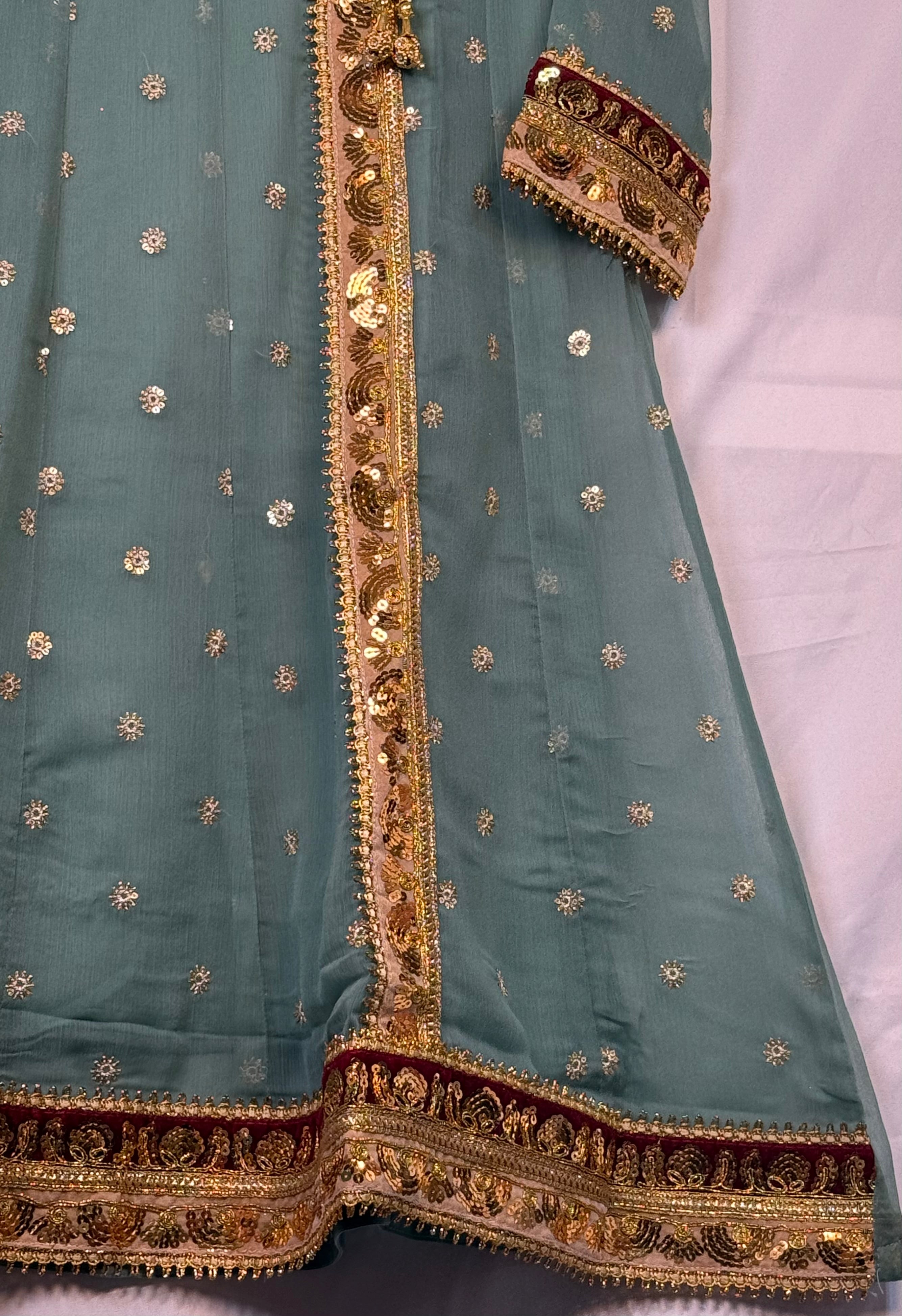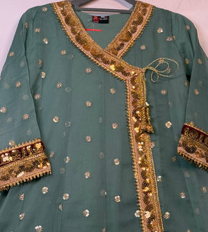 Adorn your little princess in this gorgeous Pakistani outfit. This set includes a beautifully embroidered Angrakah style shirt, and trouser. The delicate Chiffon material is perfect for your little one's sensitive skin as it has lining inside. Plus, the intricate embroidery is sure to make your little girl stand out from the crowd. She is sure to make a fashion statement in this stylish outfit. Buy Girls shirt and Trouser Online at www.areebas.co.uk Follow us on https://www.instagram.com/areebas_couture/.