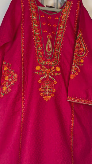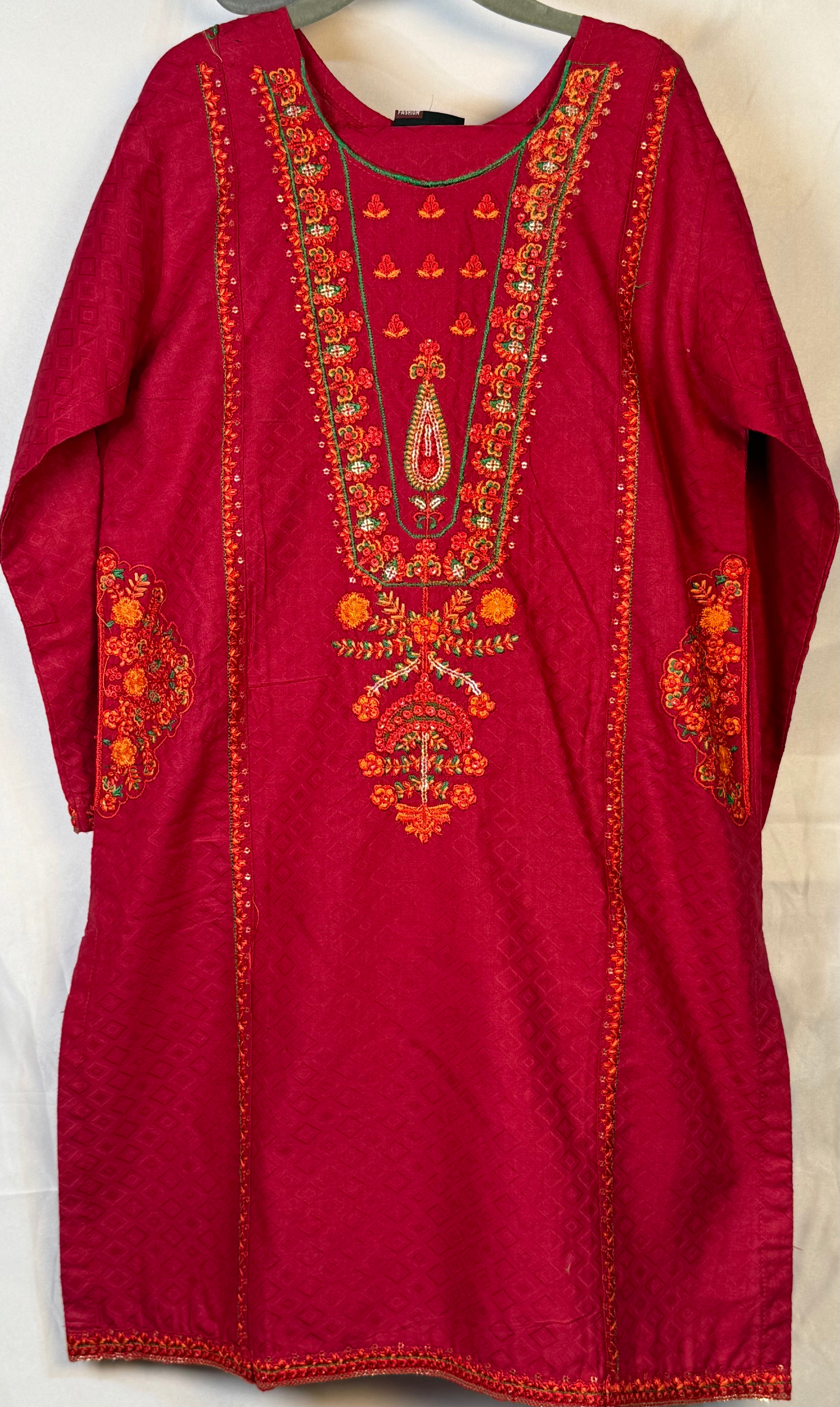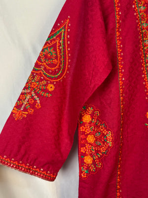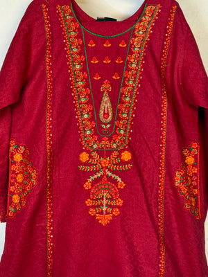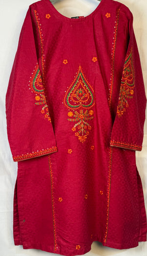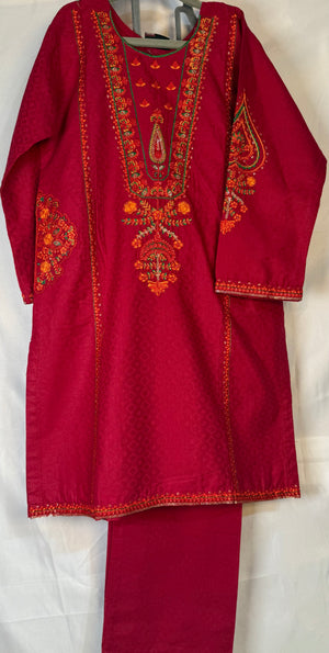 Adorn your little princess in this gorgeous Pakistani outfit. This set includes a beautifully embroidered shirt, and trouser. The delicate Egyptian cotton material is perfect for your little one's sensitive skin. Plus, the intricate embroidery is sure to make your little girl stand out from the crowd. She is sure to make a fashion statement in this stylish outfit. Matching duppta is available at extra cost.