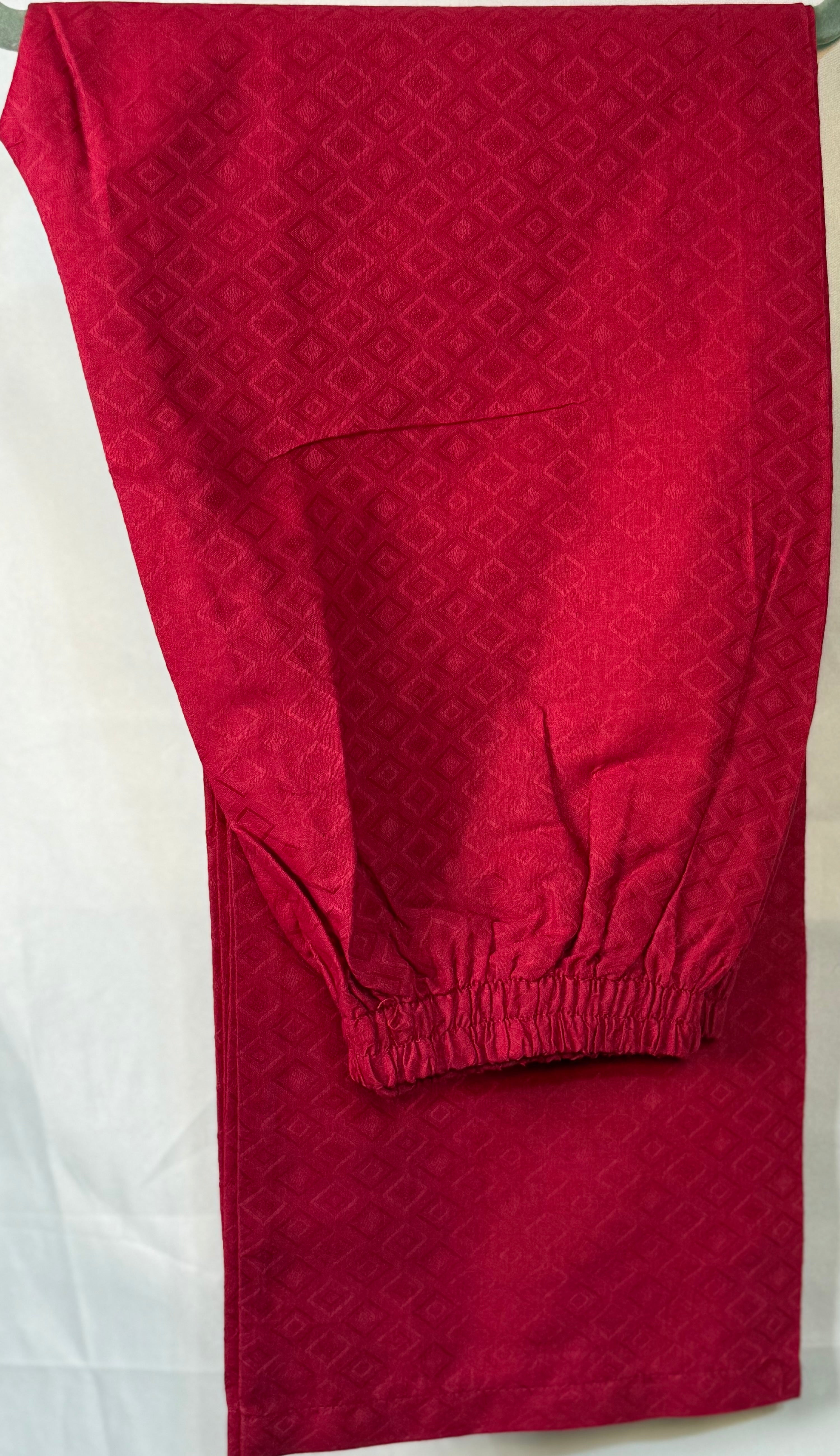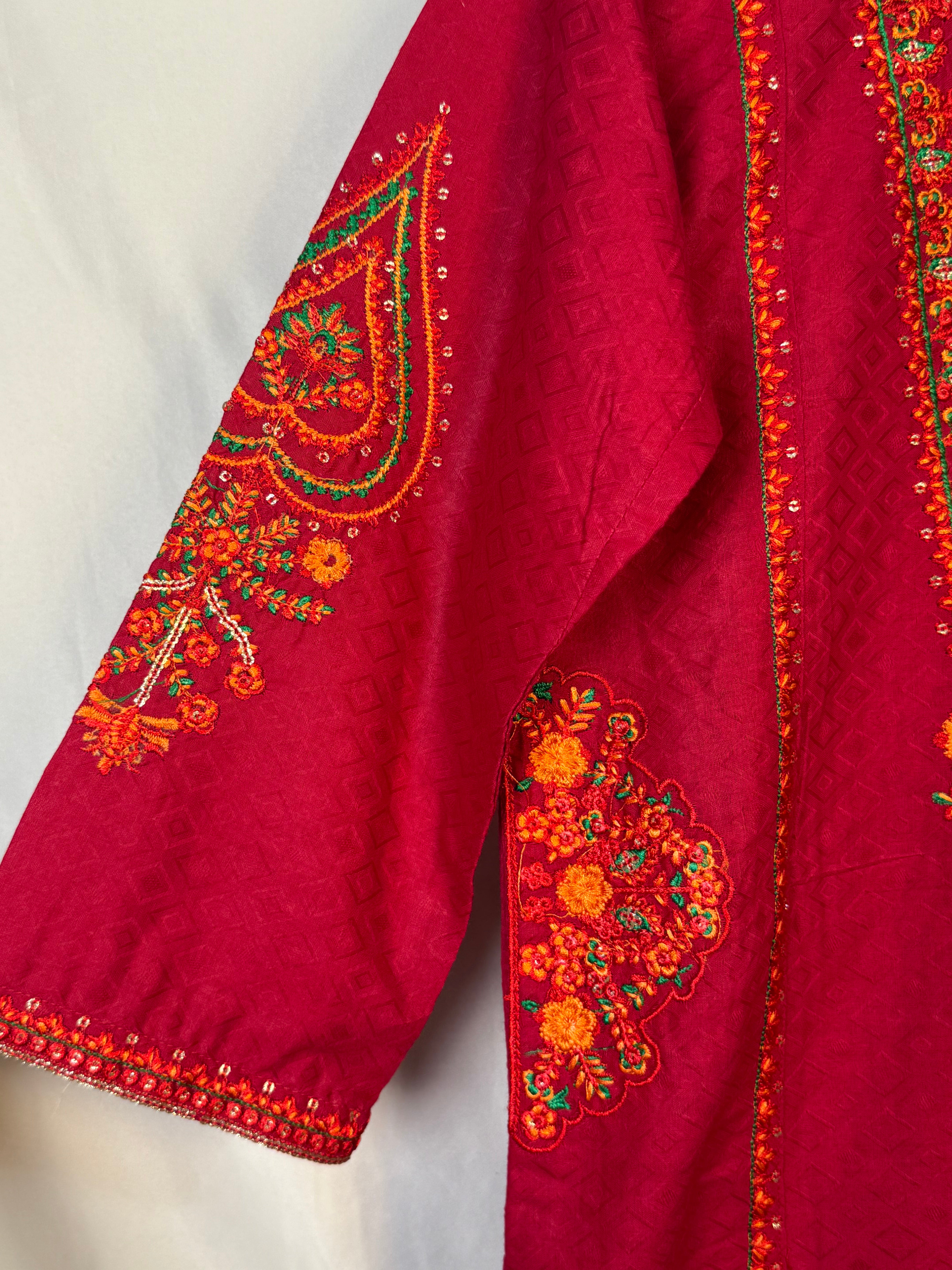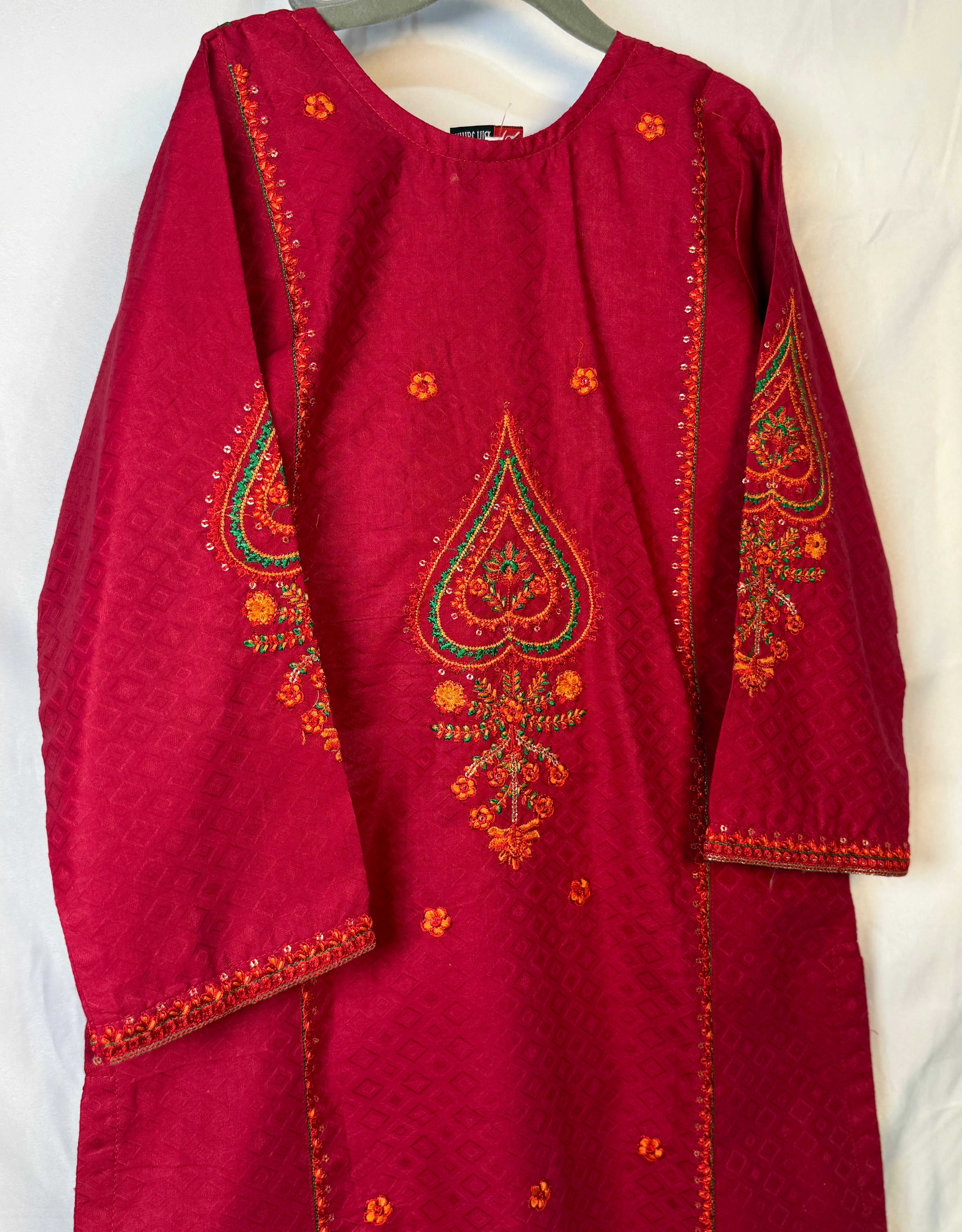 Girls Red Self-Print Egyptian Cotton Shirt & Trouser Set With Thread Emobidary (2 Piece) Gcgs-4