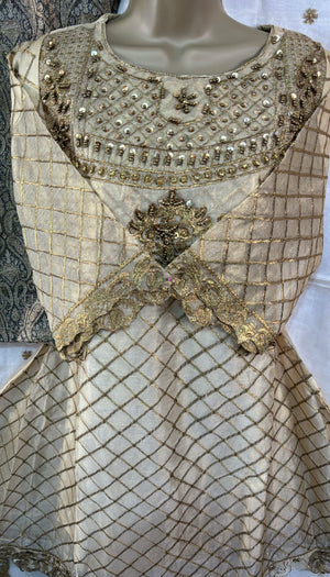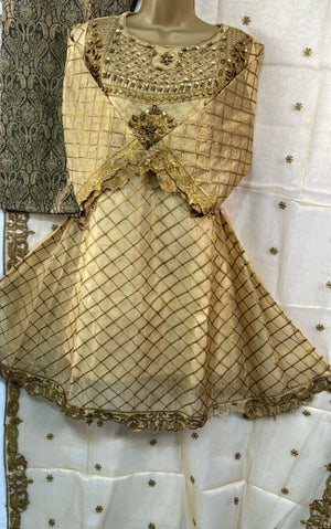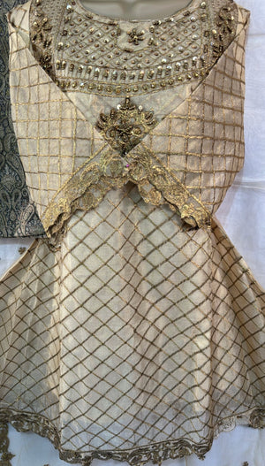 Golden Three Piece Frock Style Suit with Embellished Shirt Jamawar Trousers & Embroidered Dupatta for Any Occasion