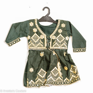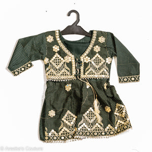 This green koti frock set with embroidery is a trendy and stylish addition to your wardrobe. Made with high-quality materials and intricate embroidery, this set is perfect for all occasions. With its beautiful design and comfortable fit, it will surely become a go-to choice for any fashion-forward individual.