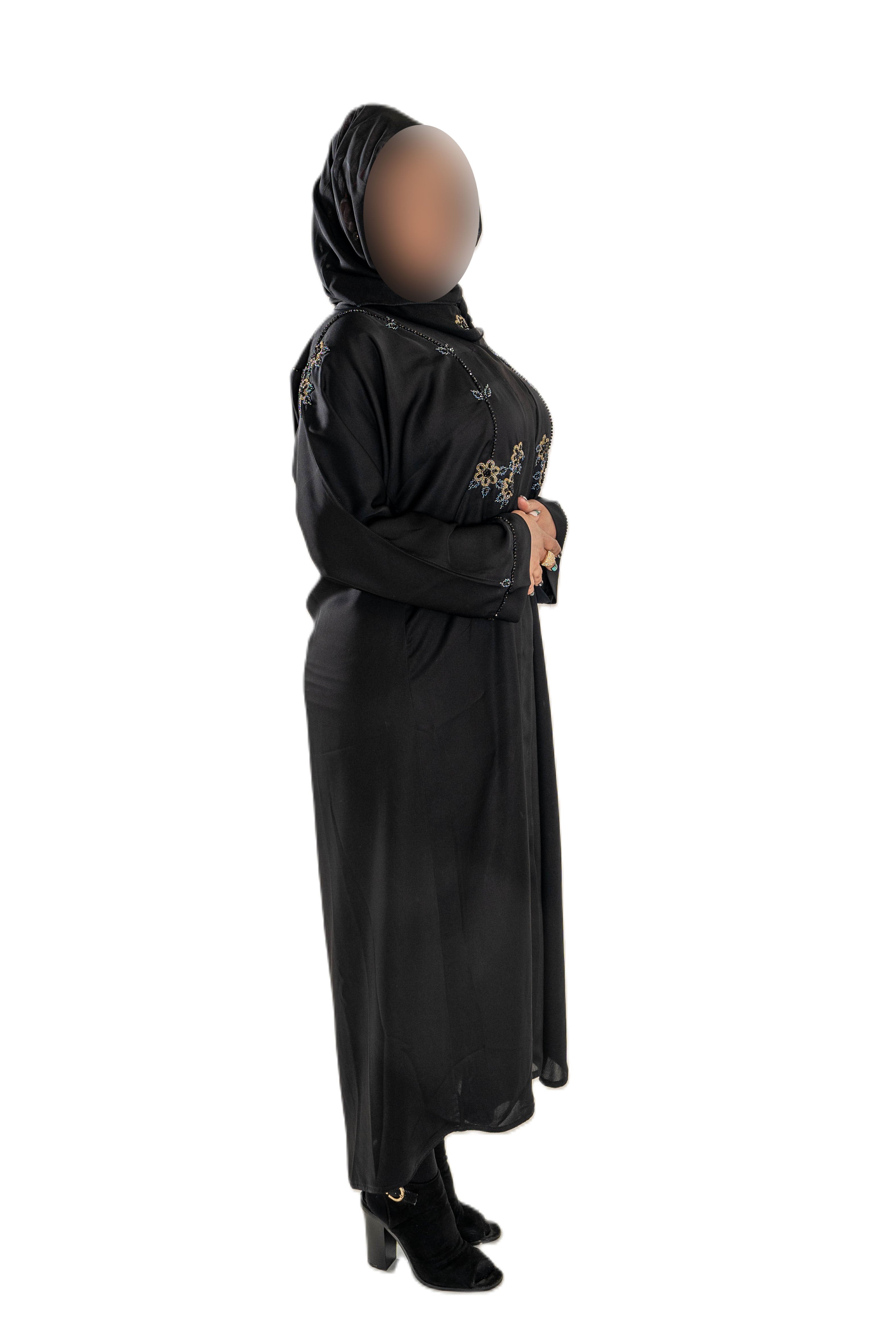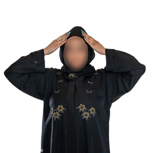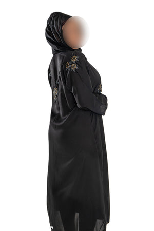 This elegant grey and gold cut dana on black abaya adds a touch of sophistication to any outfit. The intricate design showcases expert craftsmanship and is made with high-quality materials. Perfect for any formal or special occasion, this abaya is a must-have for your wardrobe.