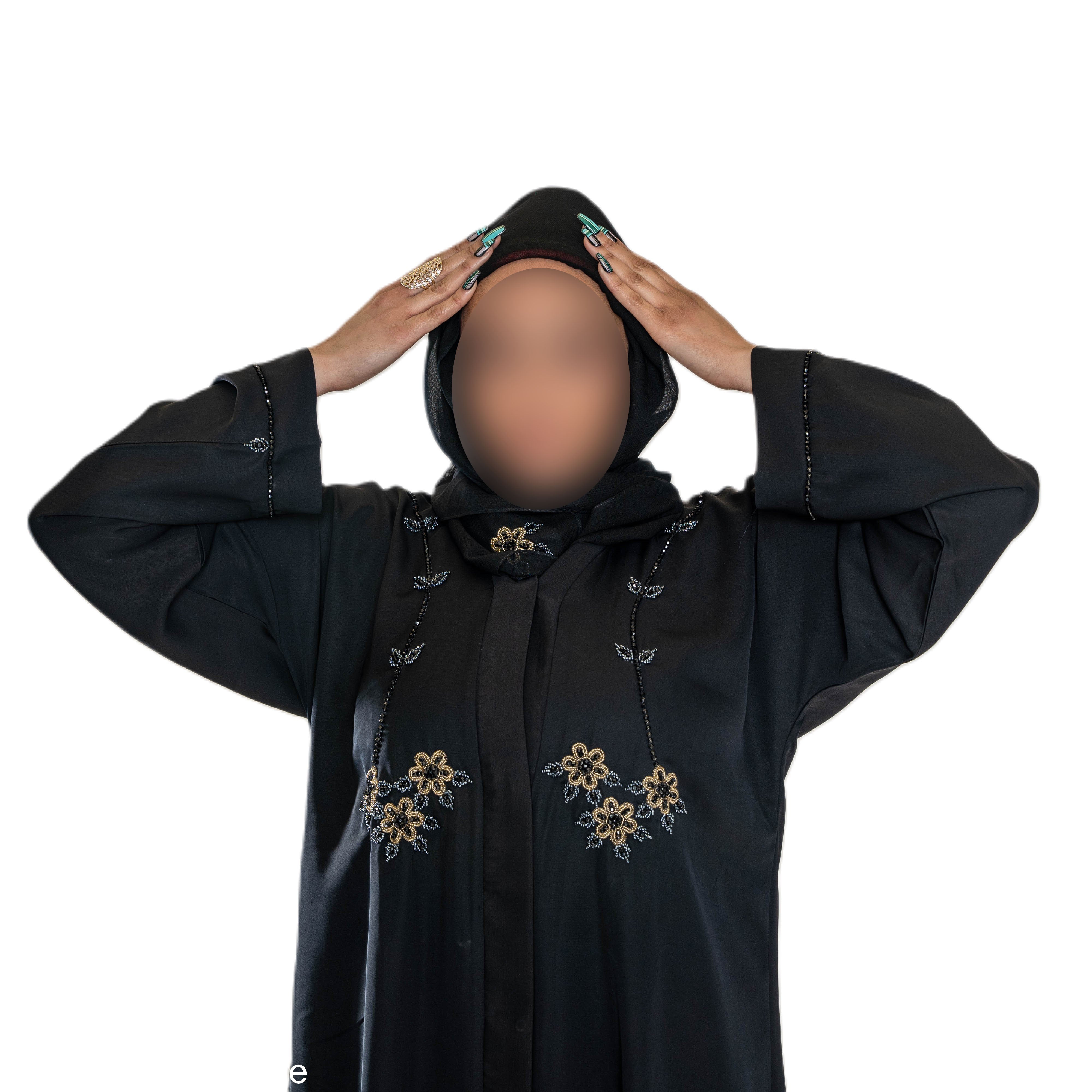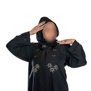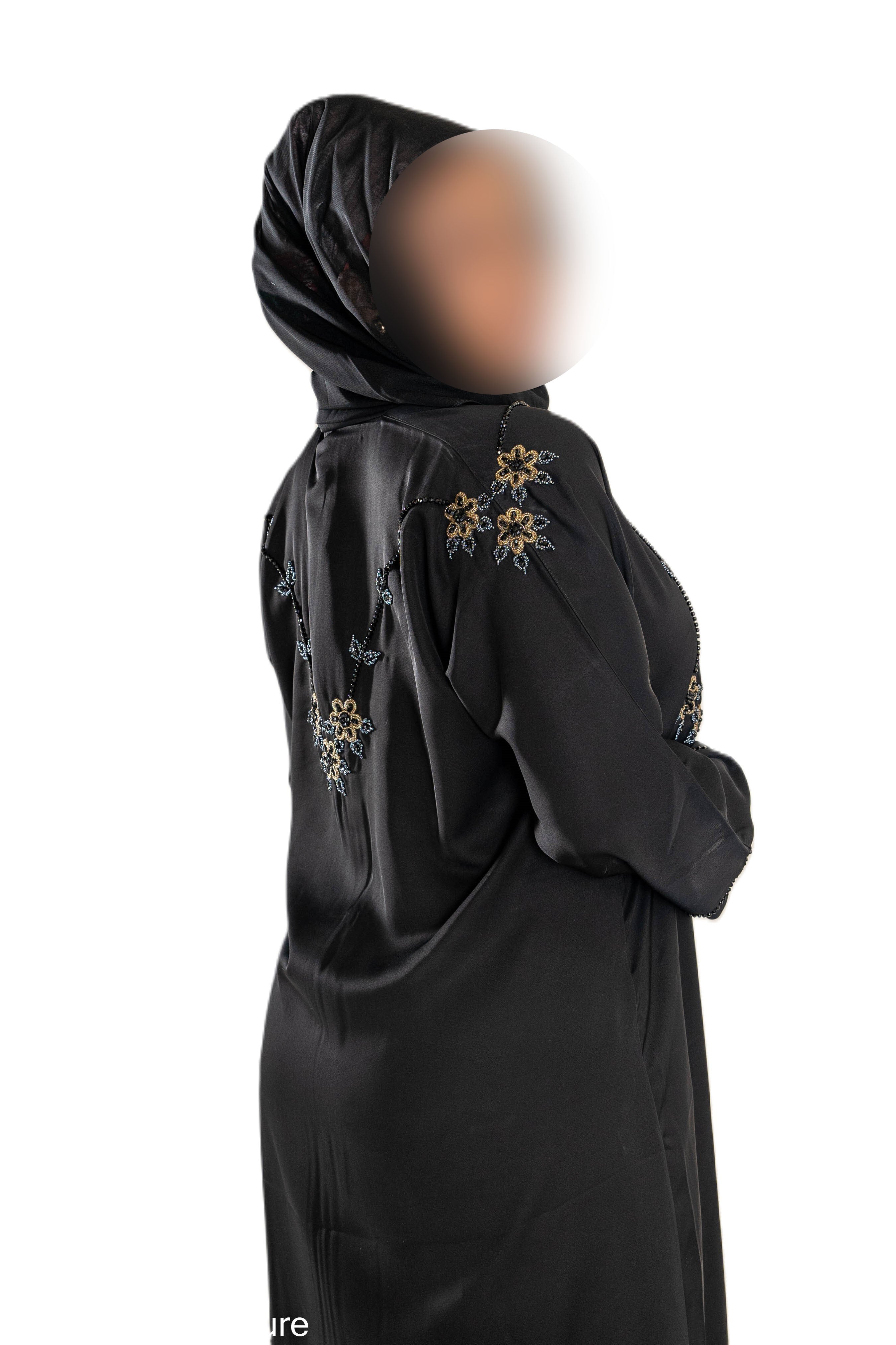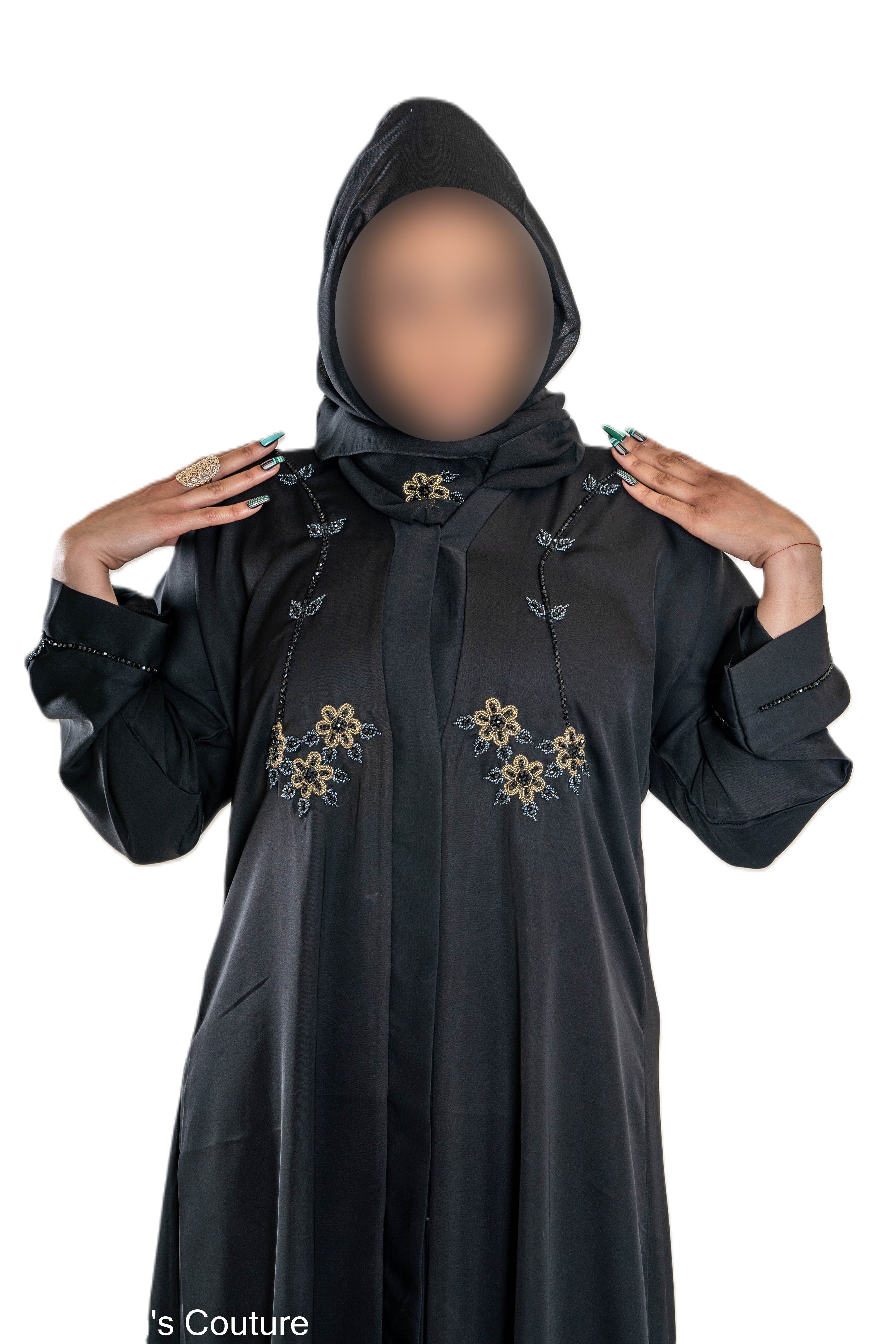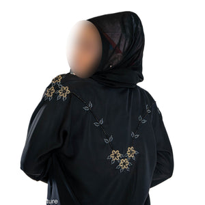 Grey and Gold Cut Dana on Black Abaya - Elegant Intricate Design for Formal Occasions