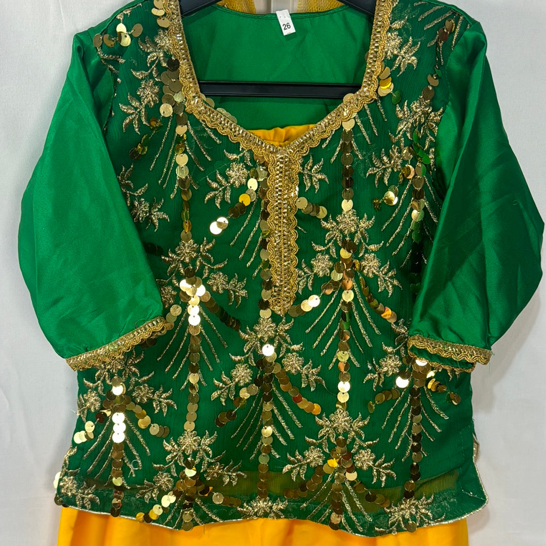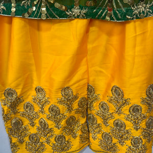 Girls Pakistani Mehndi Outfit Green Top with Gold Sequins Yellow Plazzo Net Dupatta for Festive Wear