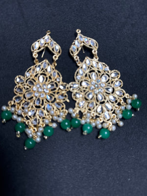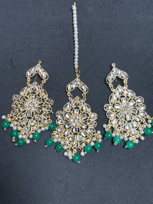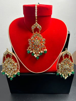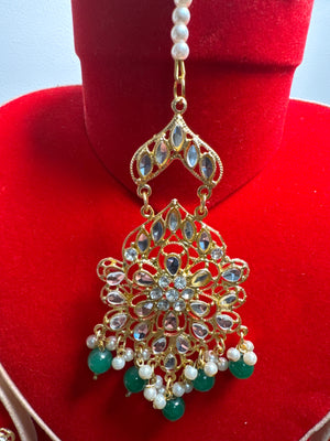 Beautiful earrings and Tikka set. A must have item for your jewellery collection. Stunning looking and attractive pair of Pakistani Earrings. The stylish shape earrings studded with sparkling white colour stones and beads all over are surely the glittering and dazzling fashion accessories.