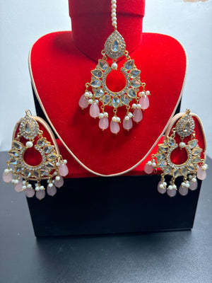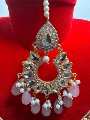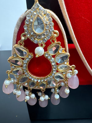 Beautiful earrings and Tikka set. A must have item for your jewellery collection. Stunning looking and attractive pair of Pakistani Earrings. The stylish shape earrings studded with sparkling white colour stones and beads all over are surely the glittering and dazzling fashion accessories.