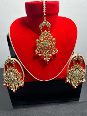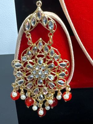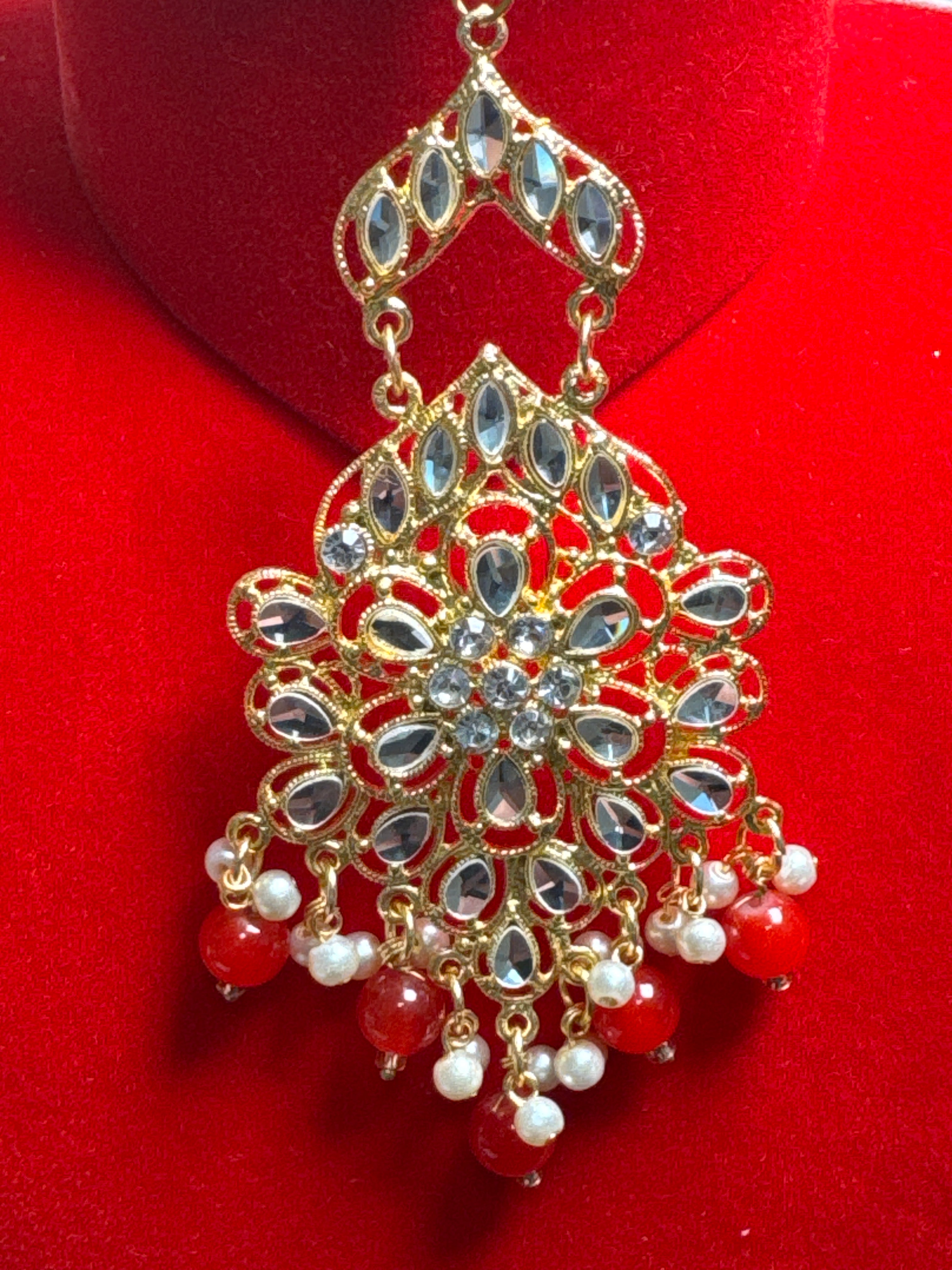 Beautiful earrings and Tikka set. A must have item for your jewellery collection. Stunning looking and attractive pair of Pakistani Earrings. The stylish shape earrings studded with sparkling white colour stones and beads all over are surely the glittering and dazzling fashion accessories.