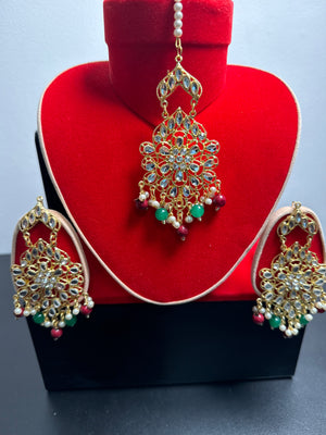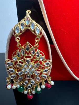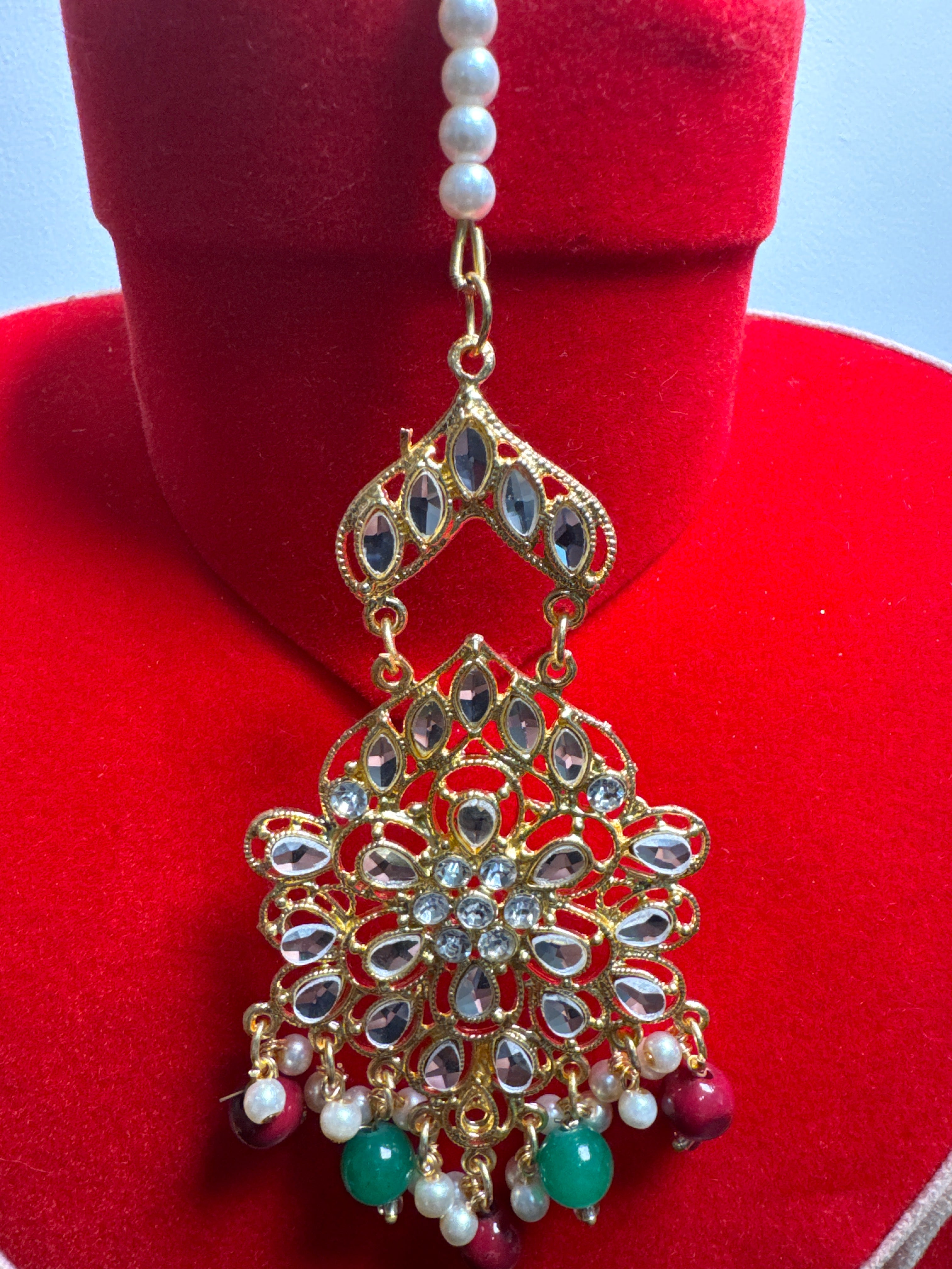 Beautiful earrings and Tikka set. A must have item for your jewellery collection. Stunning looking and attractive pair of Pakistani Earrings. The stylish shape earrings studded with sparkling white colour stones and beads all over are surely the glittering and dazzling fashion accessories.