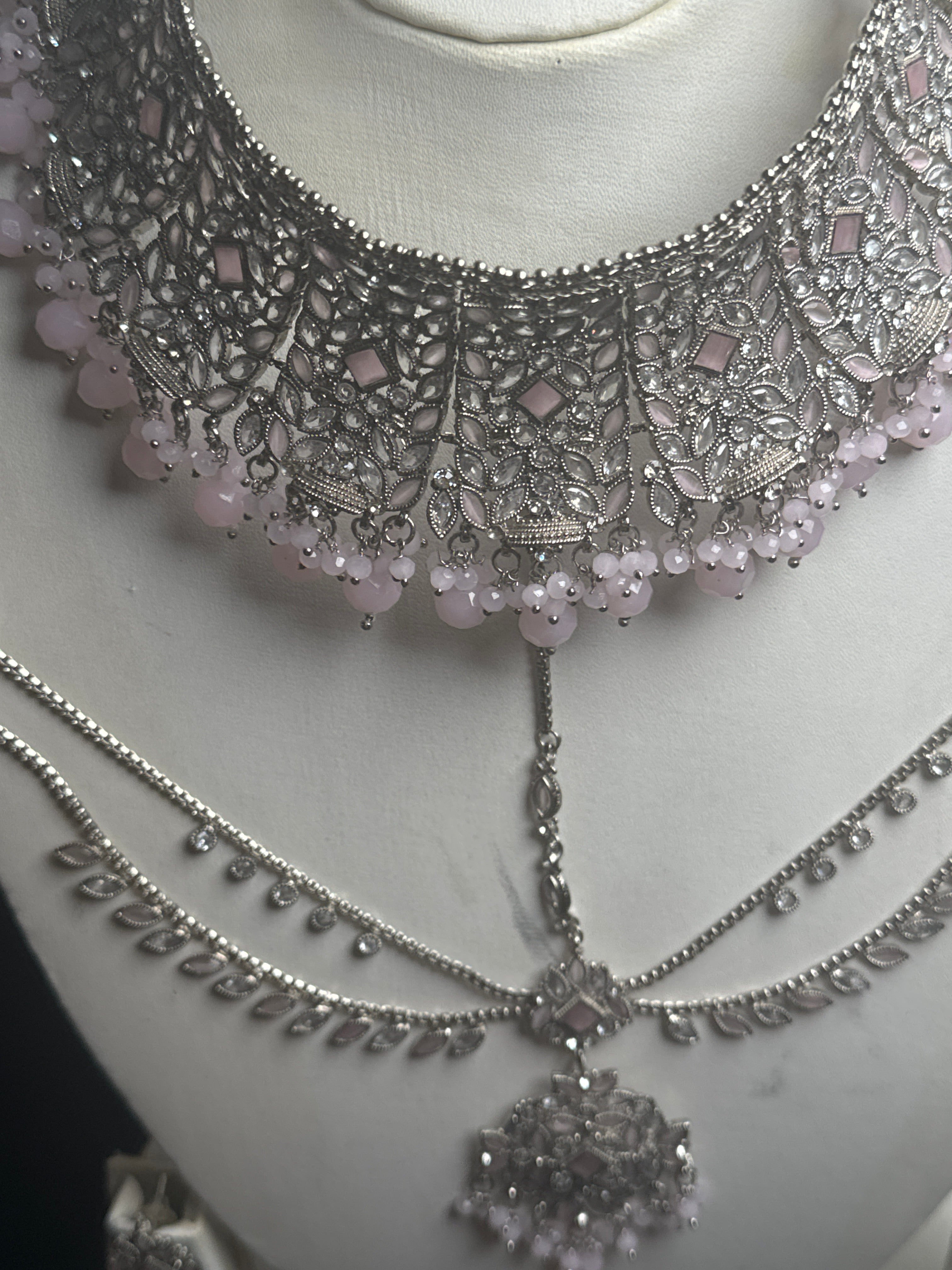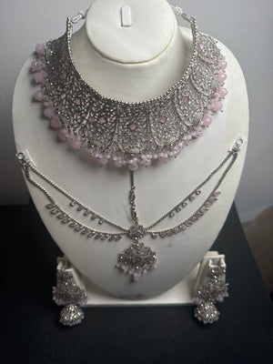 This Indian jewellery set features a choker necklace with matching earrings, Jhumar and Bindi. Crafted from the finest gold, it provides the perfect combination of elegance and durability. The classic design is sure to be a timeless addition to any jewellery collection.