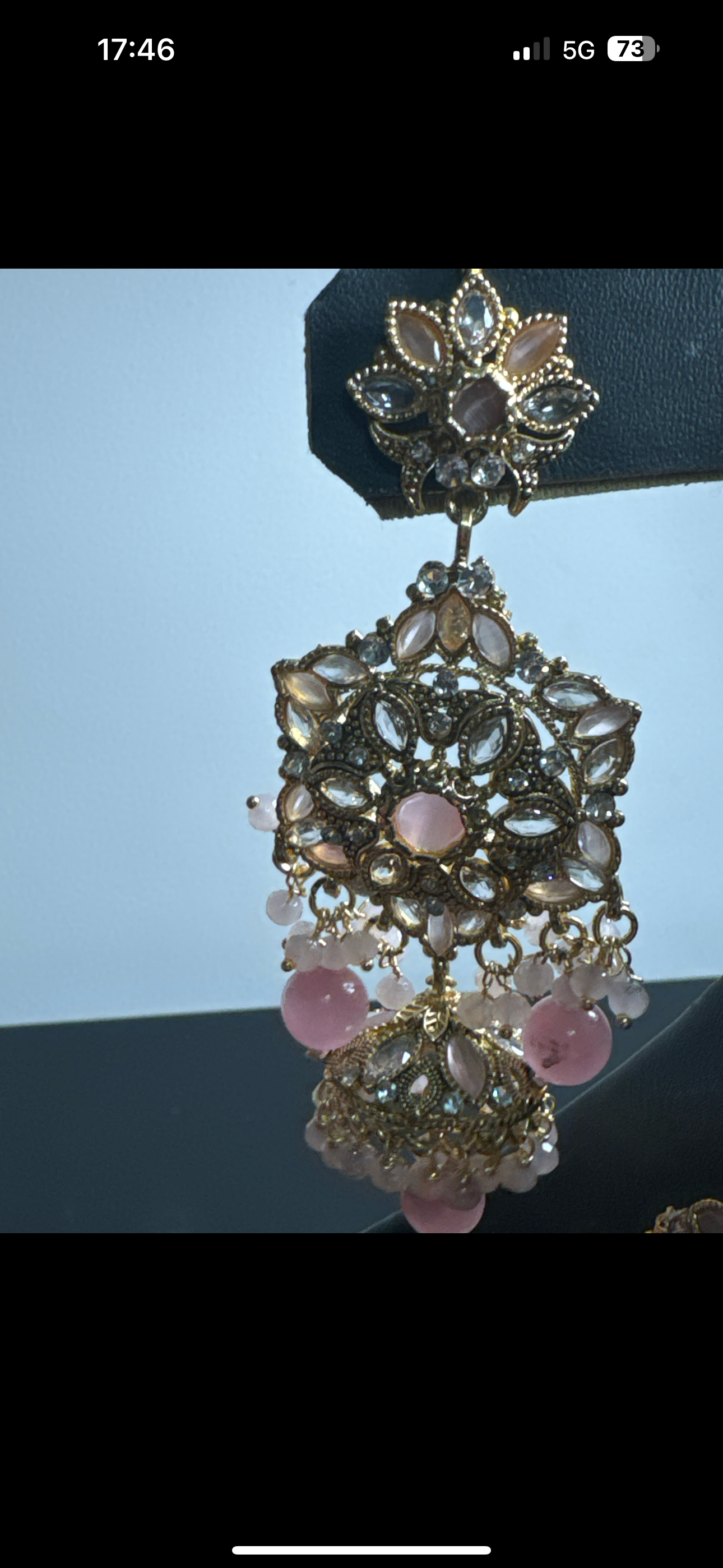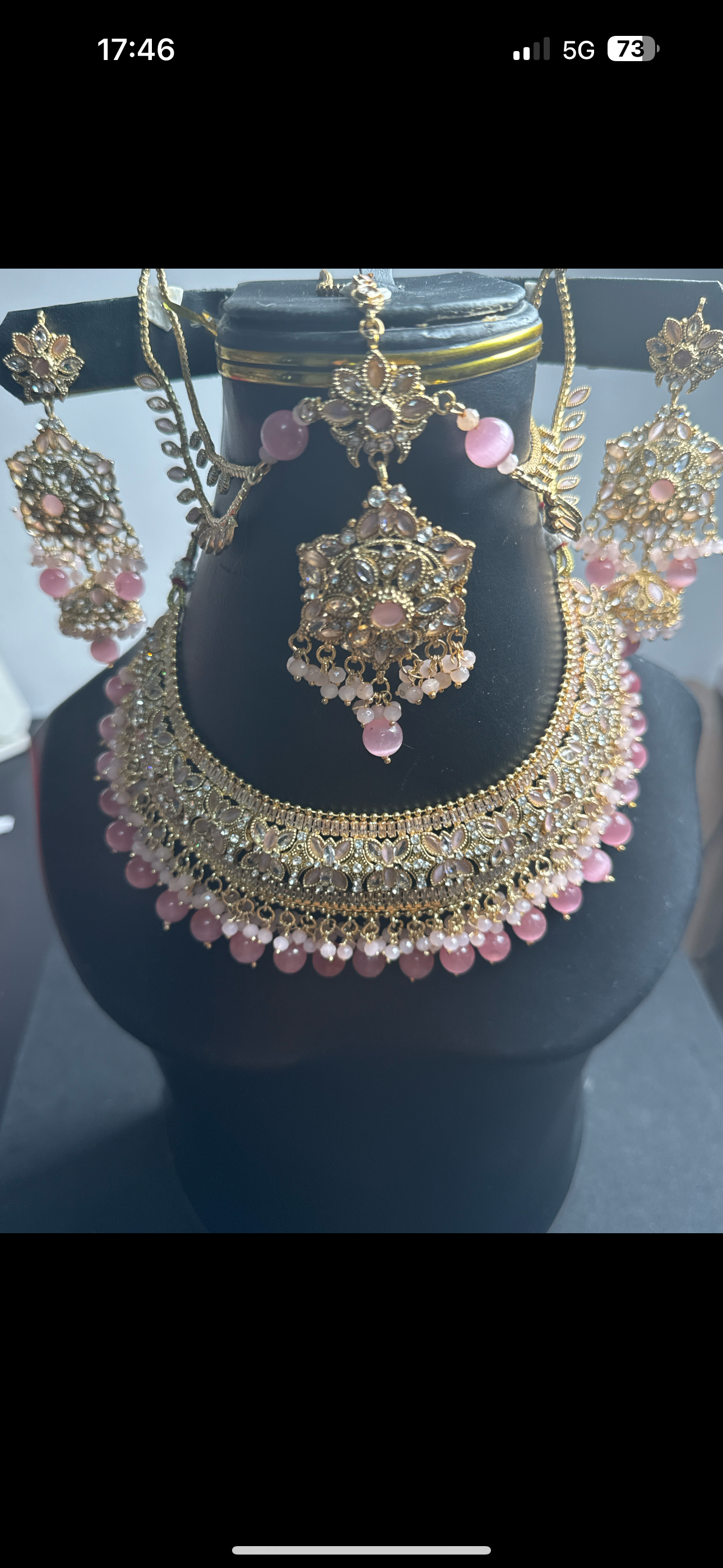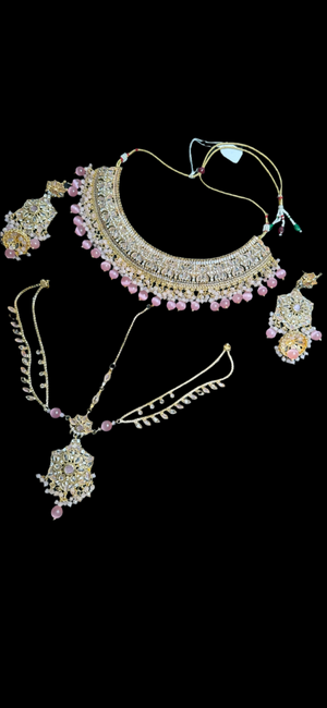 Gold colour Jewellery set with necklace, earrings and Matha pitti with pink pearls -JS45
