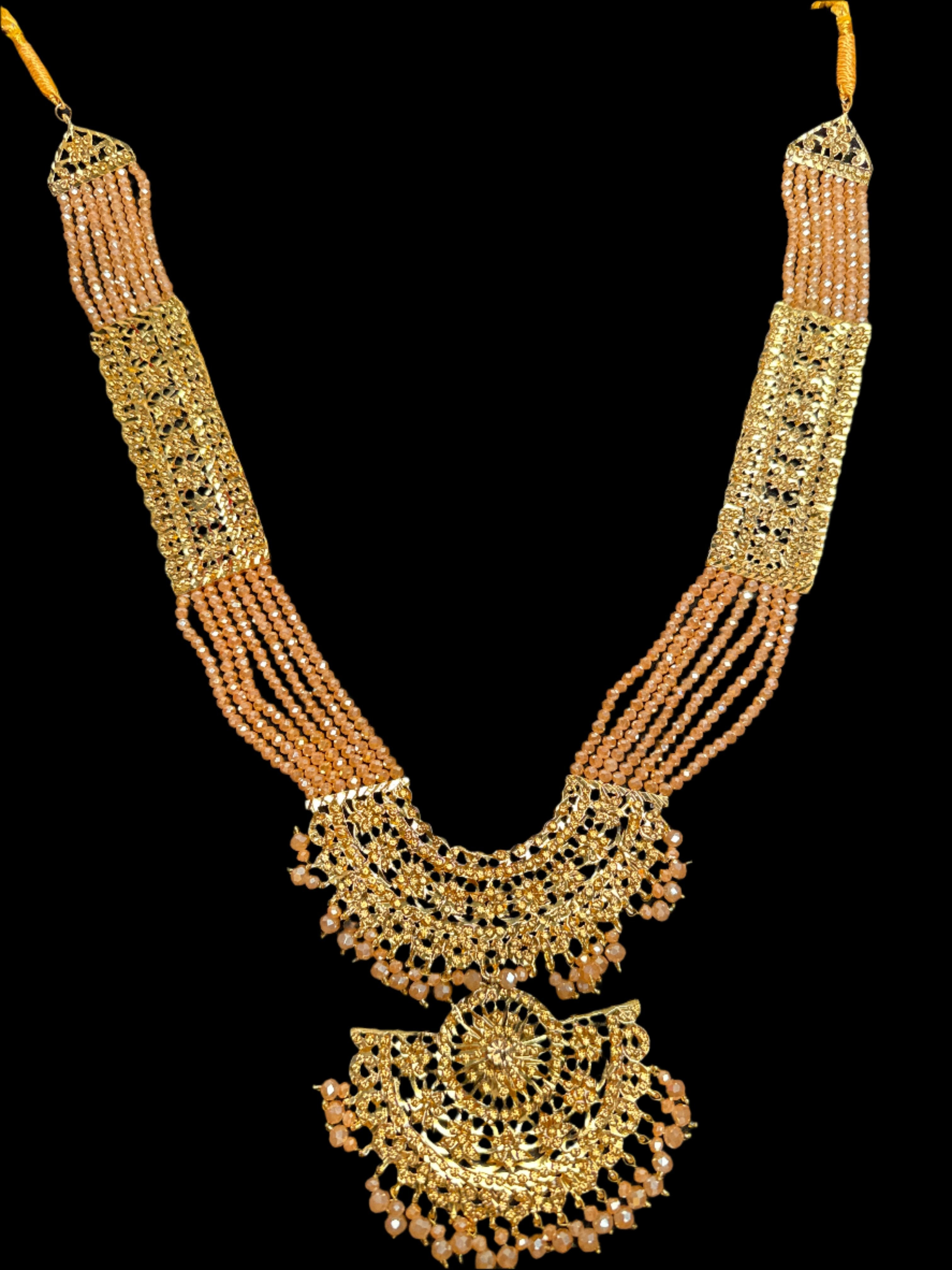 This Mala set consists of a long mala, a choker, earrings, a Bindi, and a Jomer. With its carefully selected combination of traditional jewellery, it creates a unique and beautiful look that's ideal for any traditional occasion. Crafted from premium materials, its pieces are sturdy and durable, ensuring an impeccable look for years to come.