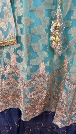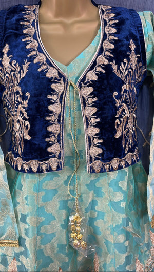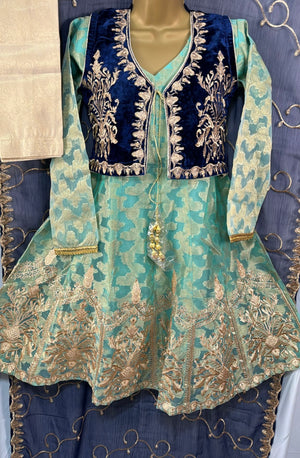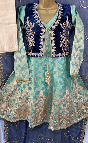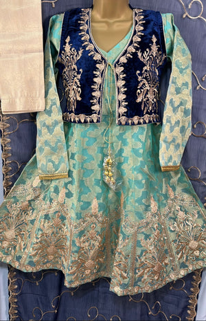 Three piece frock style suit , koti is of Valvet material ,with embroidery and tassel and frock is of soft soft cotton silk material , with plain trouser , this suit is perfect for any occasion