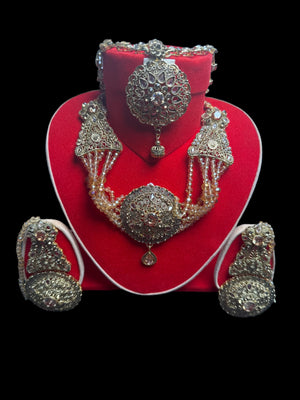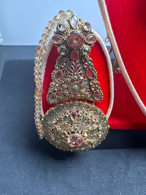 Gold colour Jewellery set with necklace, earrings and Matha Pitti with bronze & gold pearls -KS10
