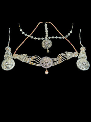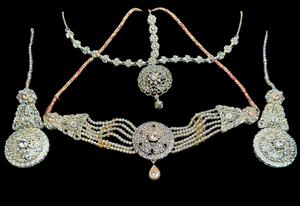 This Indian jewellery set features a choker necklace with matching earrings and Tika. Crafted from the finest golden material, it provides the perfect combination of elegance and durability. The classic design is sure to be a timeless addition to any jewellery collection.