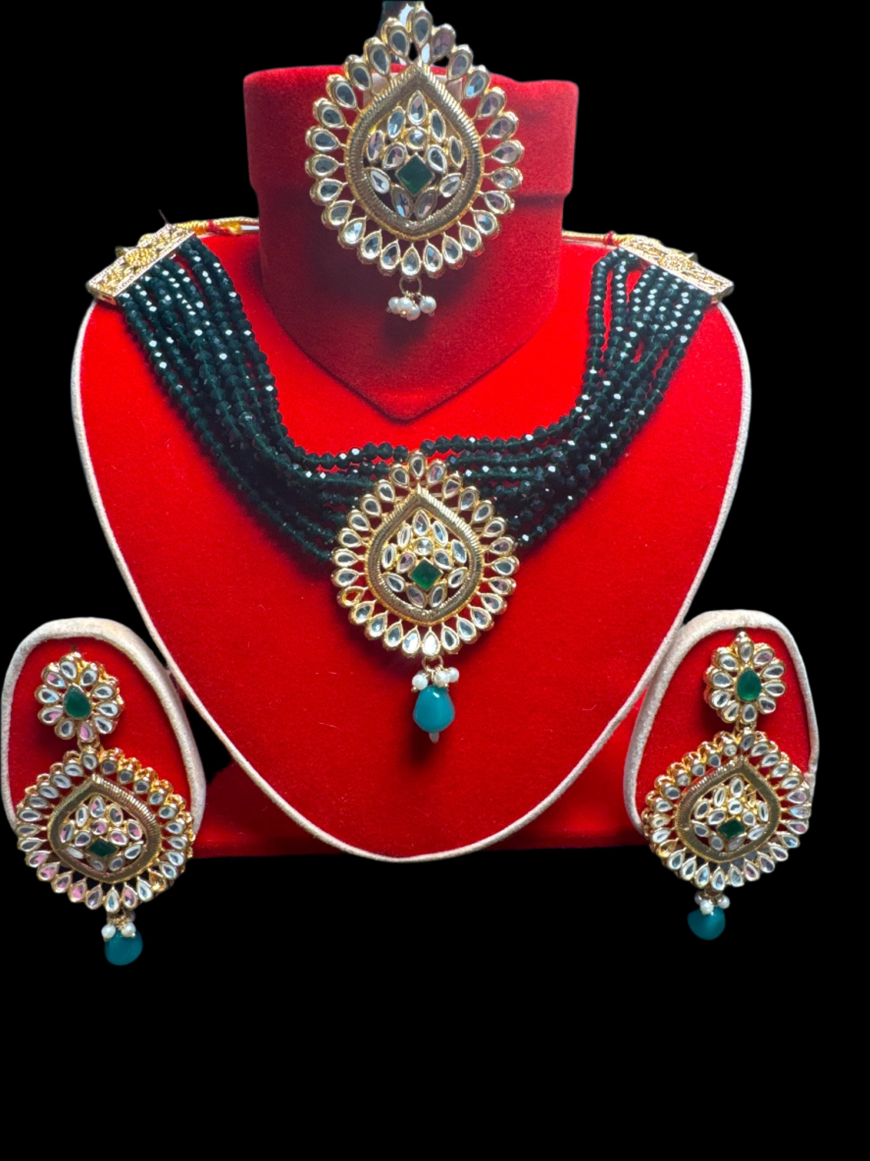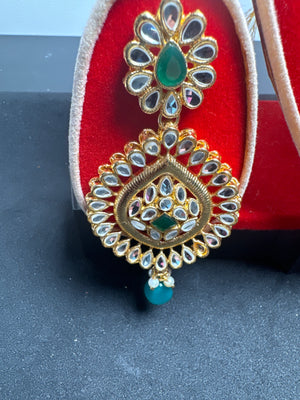 Gold colour Jewellery set with necklace, earrings and Teeka with Green & gold pearls -KS11