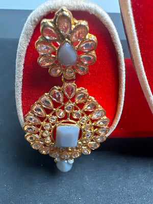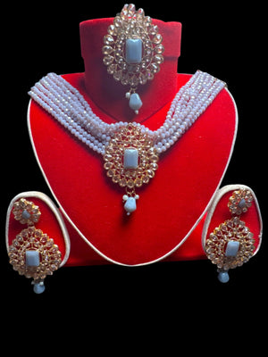 Gold colour Jewellery set with necklace, earrings and Teeka with purple & grey pearls -KS12