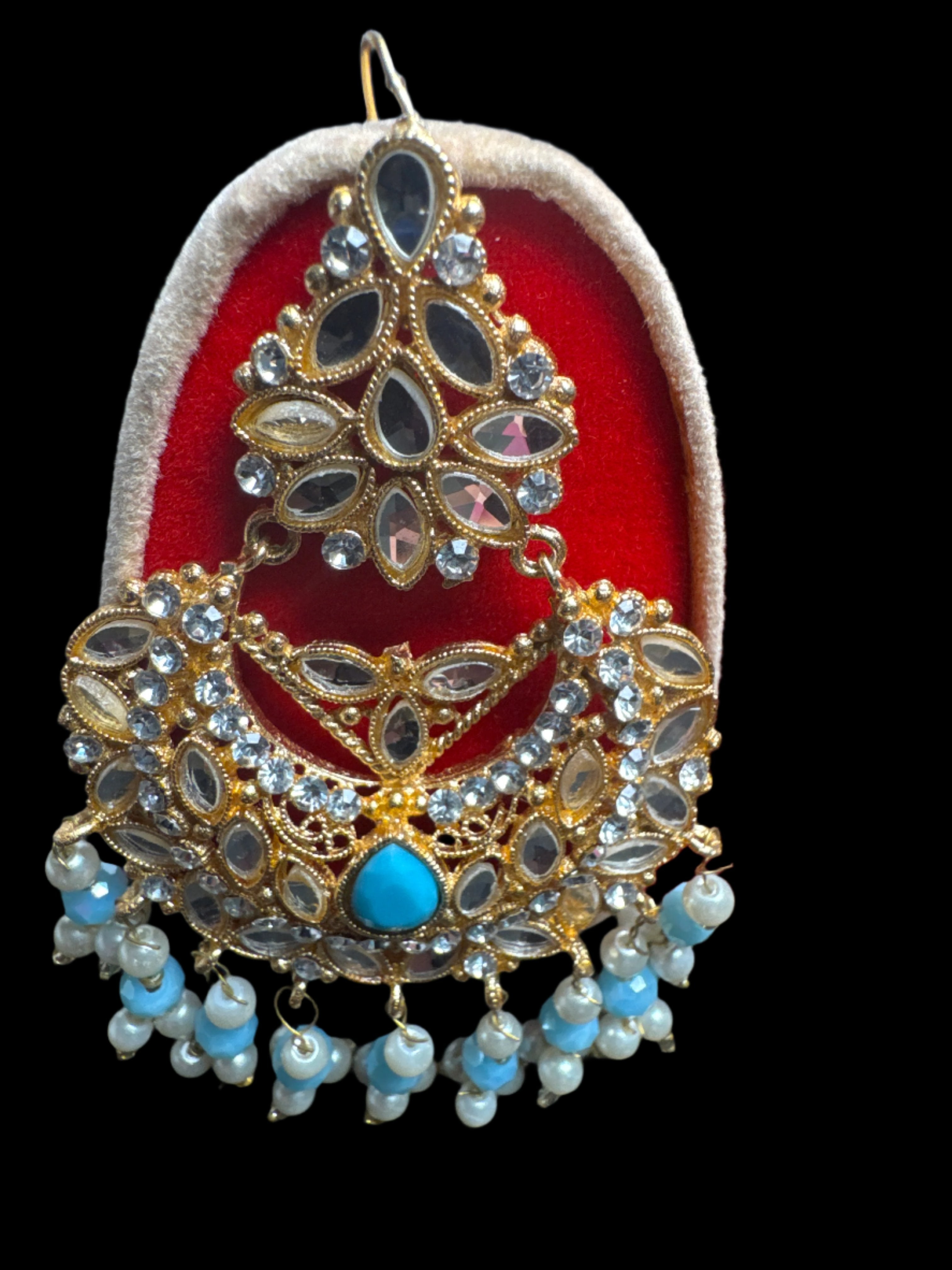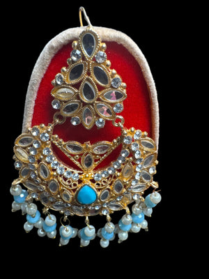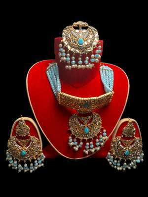Gold colour Jewellery set with necklace, earrings and Teeka with Ferozi & gold pearls - KS4