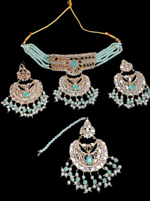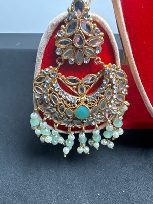 Gold colour Jewellery set with necklace, earrings and Teeka with Mint Green & white pearls -KS6