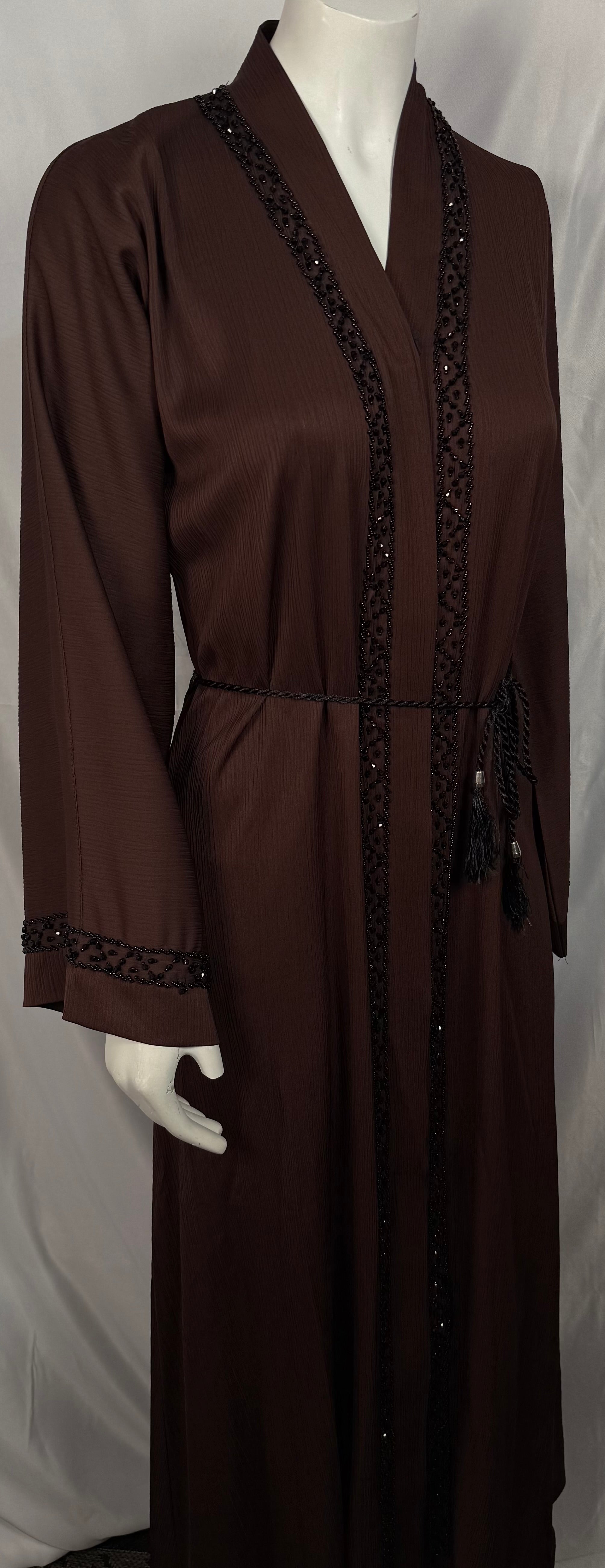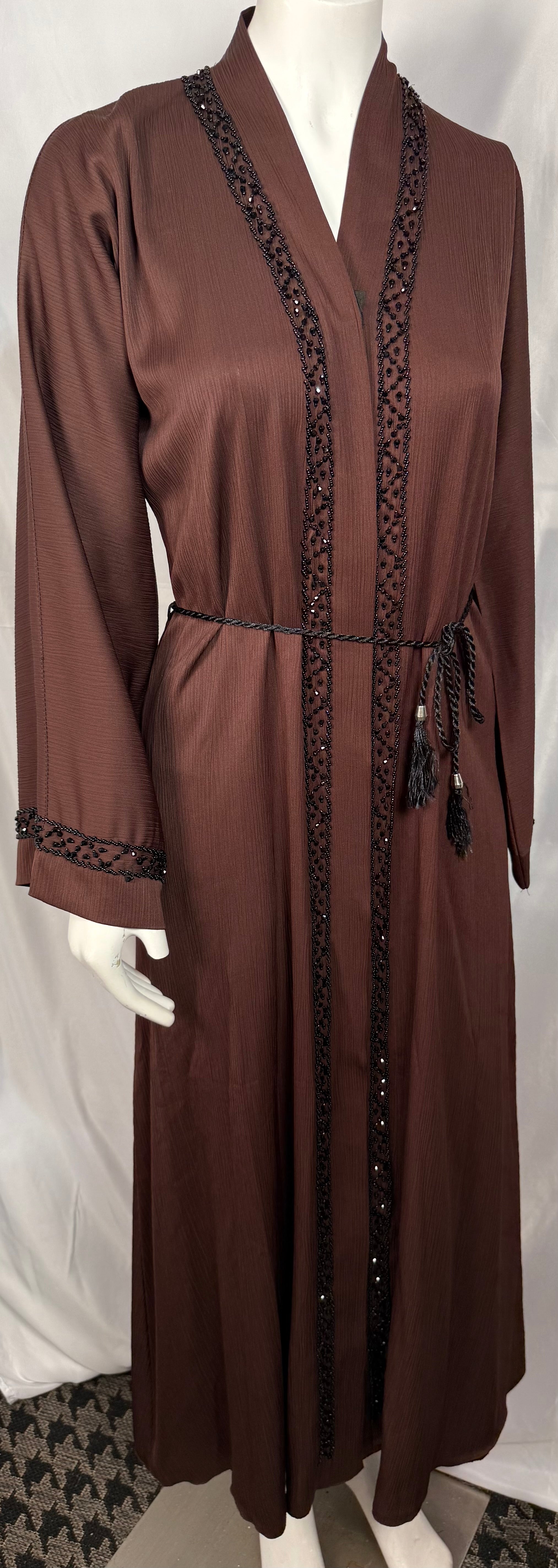Ladies Brown Abaya With Bead Work Elegant Style Black Pearbeads Thread Formal Occasion Versatile High-Quality Materials