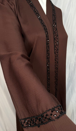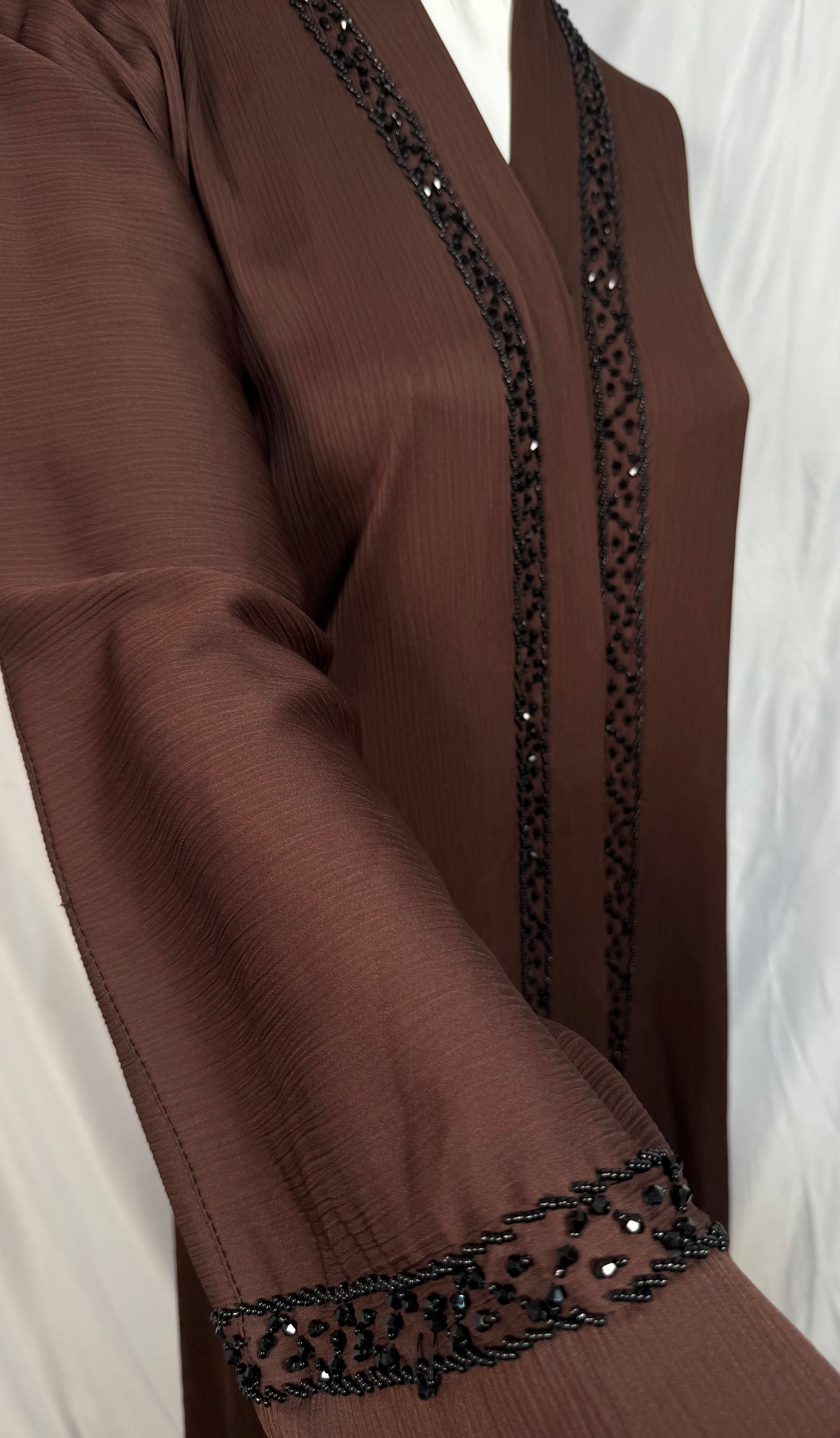 This Brown colour abaya combines elegant style with intricate details with black pearbeads and thread. The design add a touch of sophistication, making it the perfect choice for a formal occasion. The Brown-color design makes it a versatile piece that can be styled in various ways. Elevate your look with this stunning abaya. Crafted from high-quality materials, it ensures long-lasting durability and exceptional comfort for everyday wear.