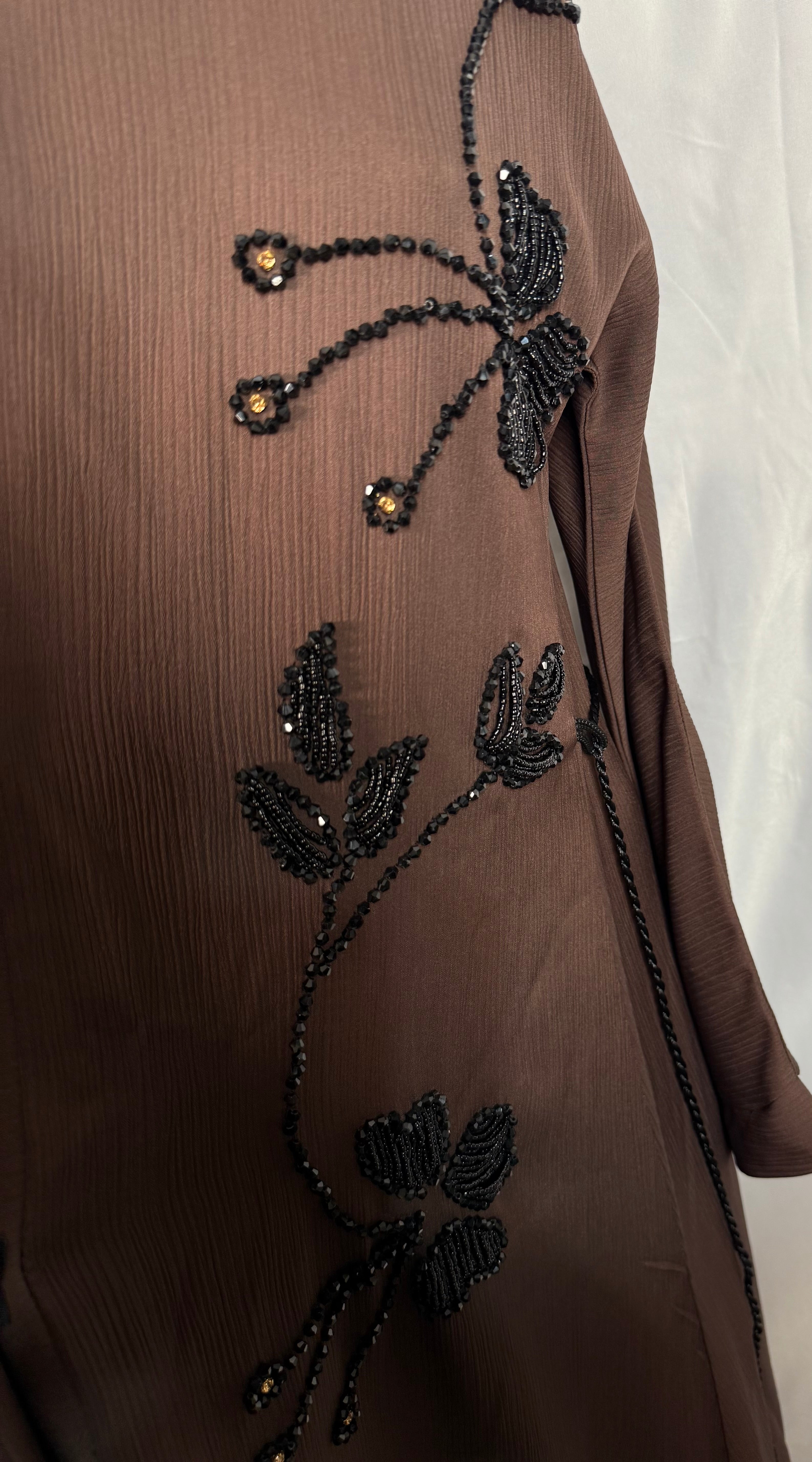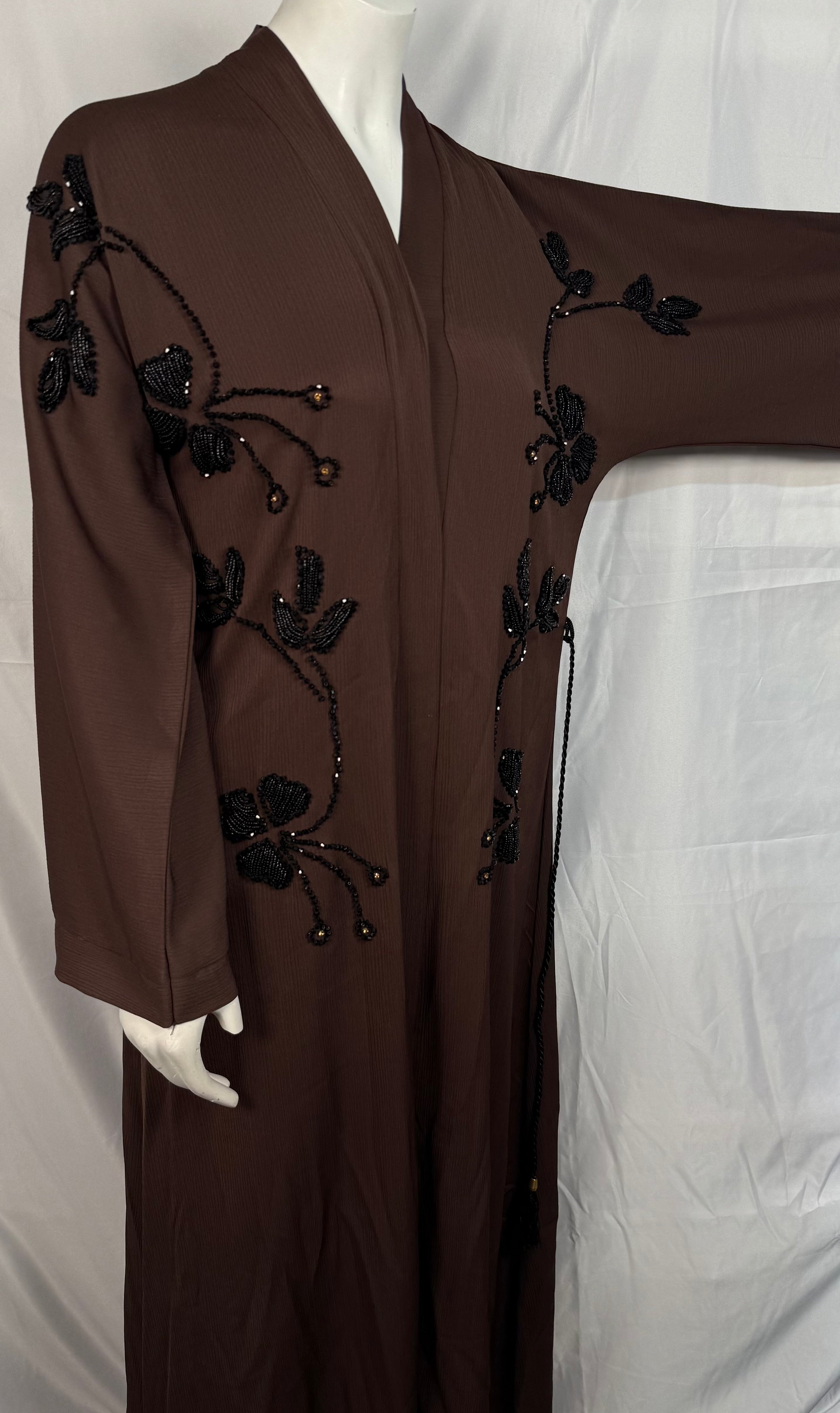 This Brown colour abaya combines elegant style with intricate details with black pearls/beads and thread. The embroidered flowered design add a touch of sophistication, making it the perfect choice for a formal occasion. The Brown-color design makes it a versatile piece that can be styled in various ways. Elevate your look with this stunning abaya. Crafted from high-quality materials, it ensures long-lasting durability and exceptional comfort for everyday wear.