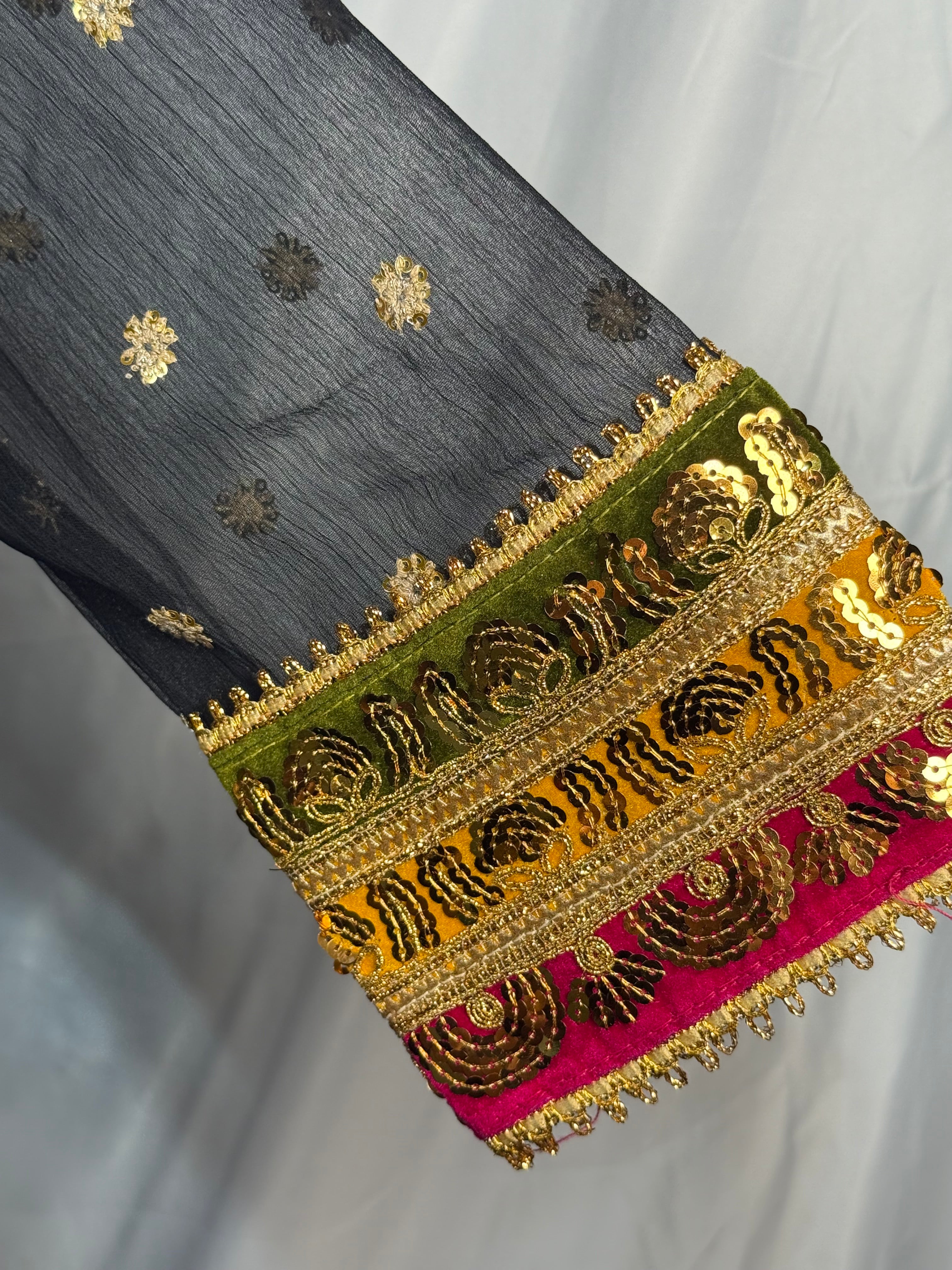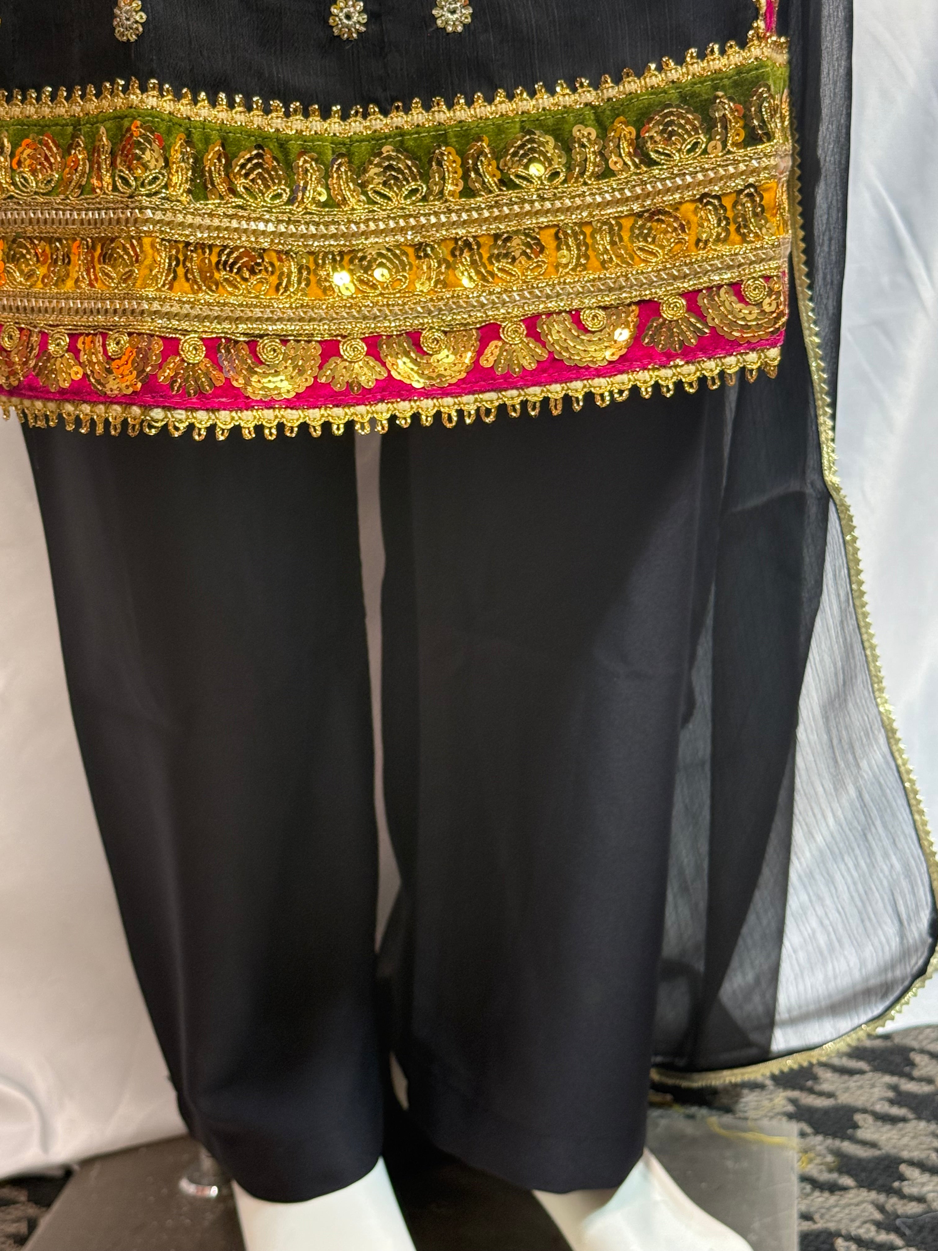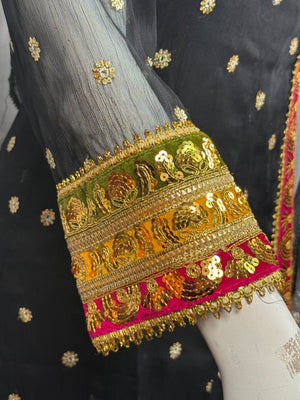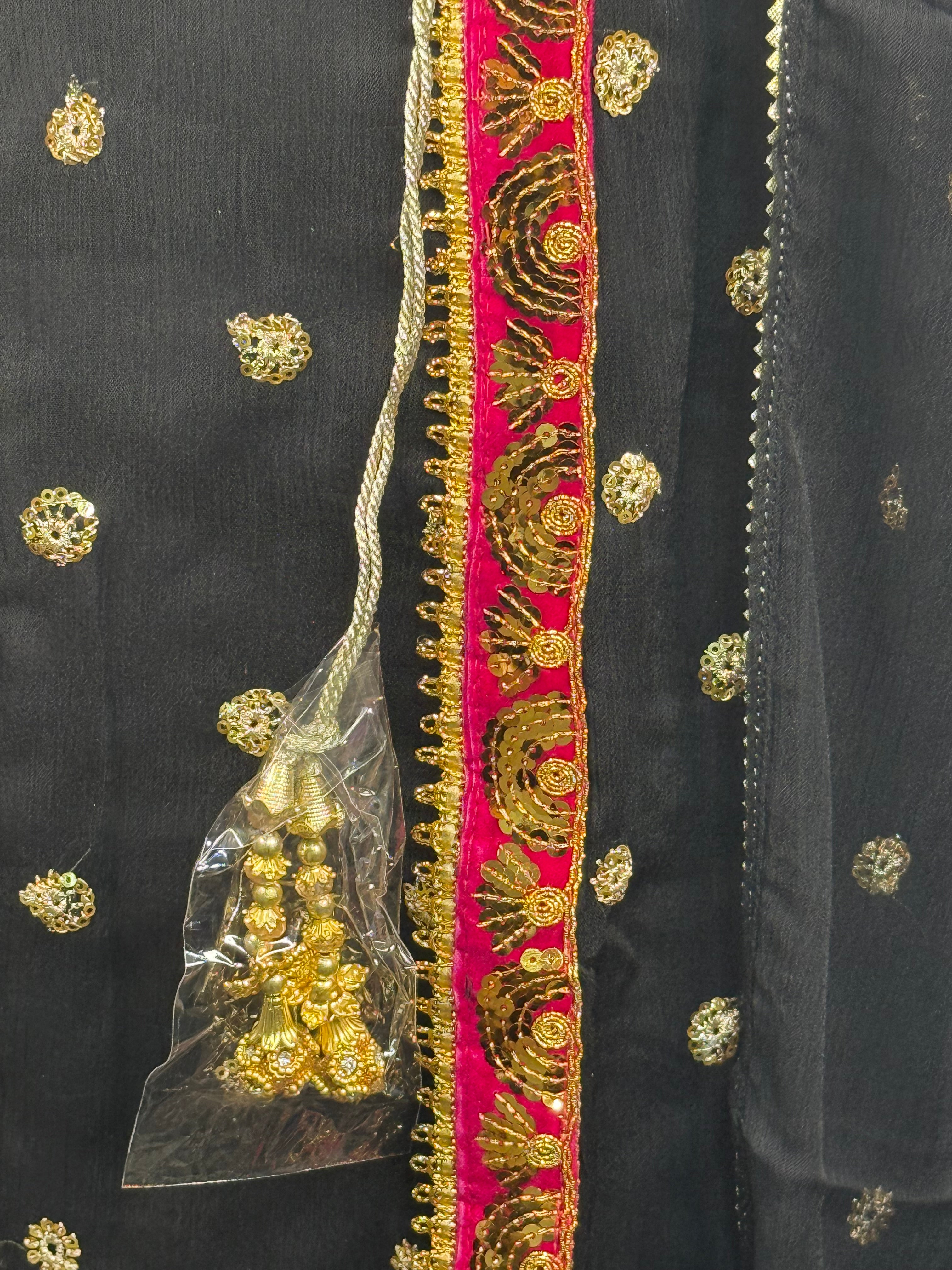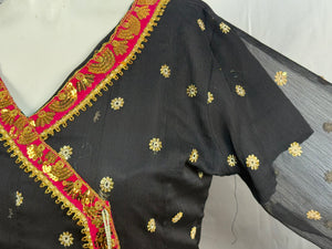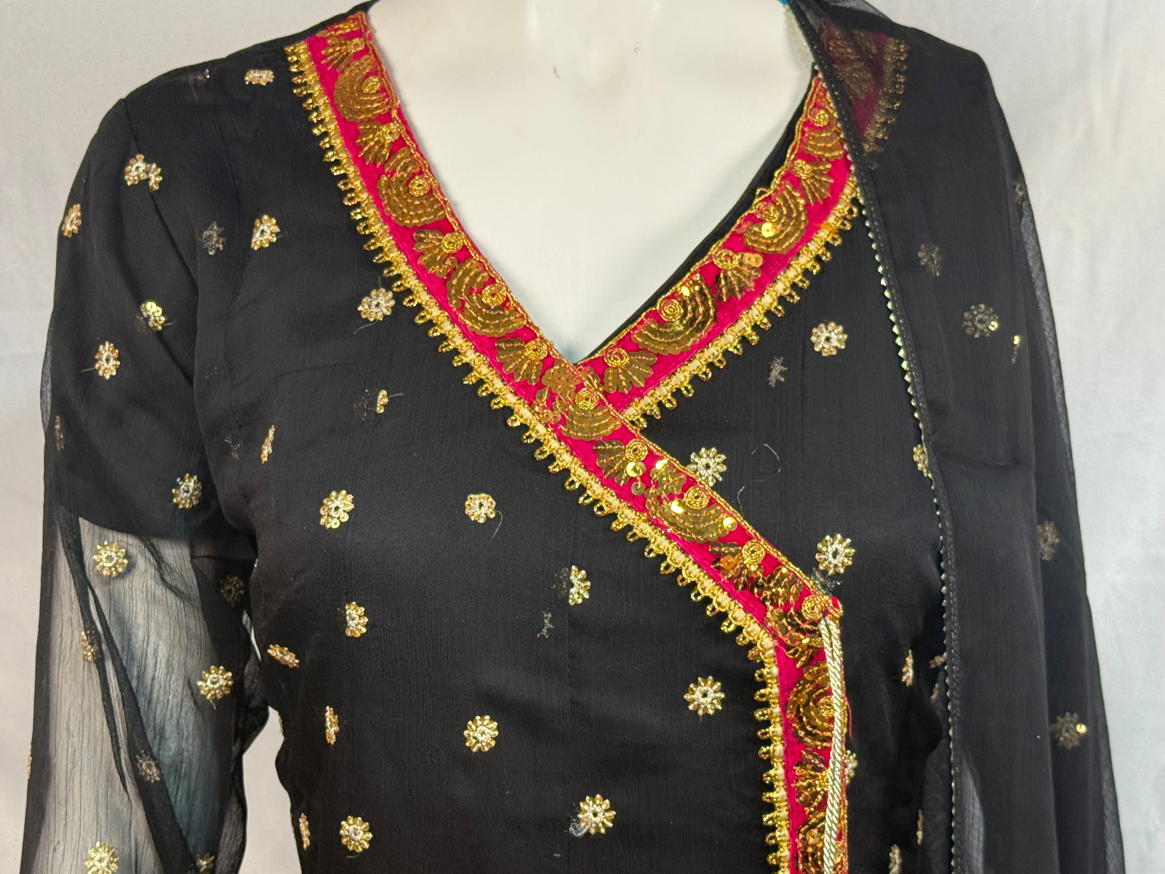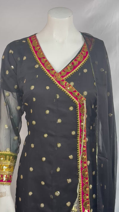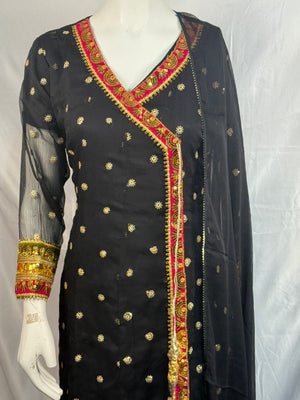 Ladies Black Chiffon Angrakah Style 3 Pcs Suit With Embroidery On Shirt (Last-04)