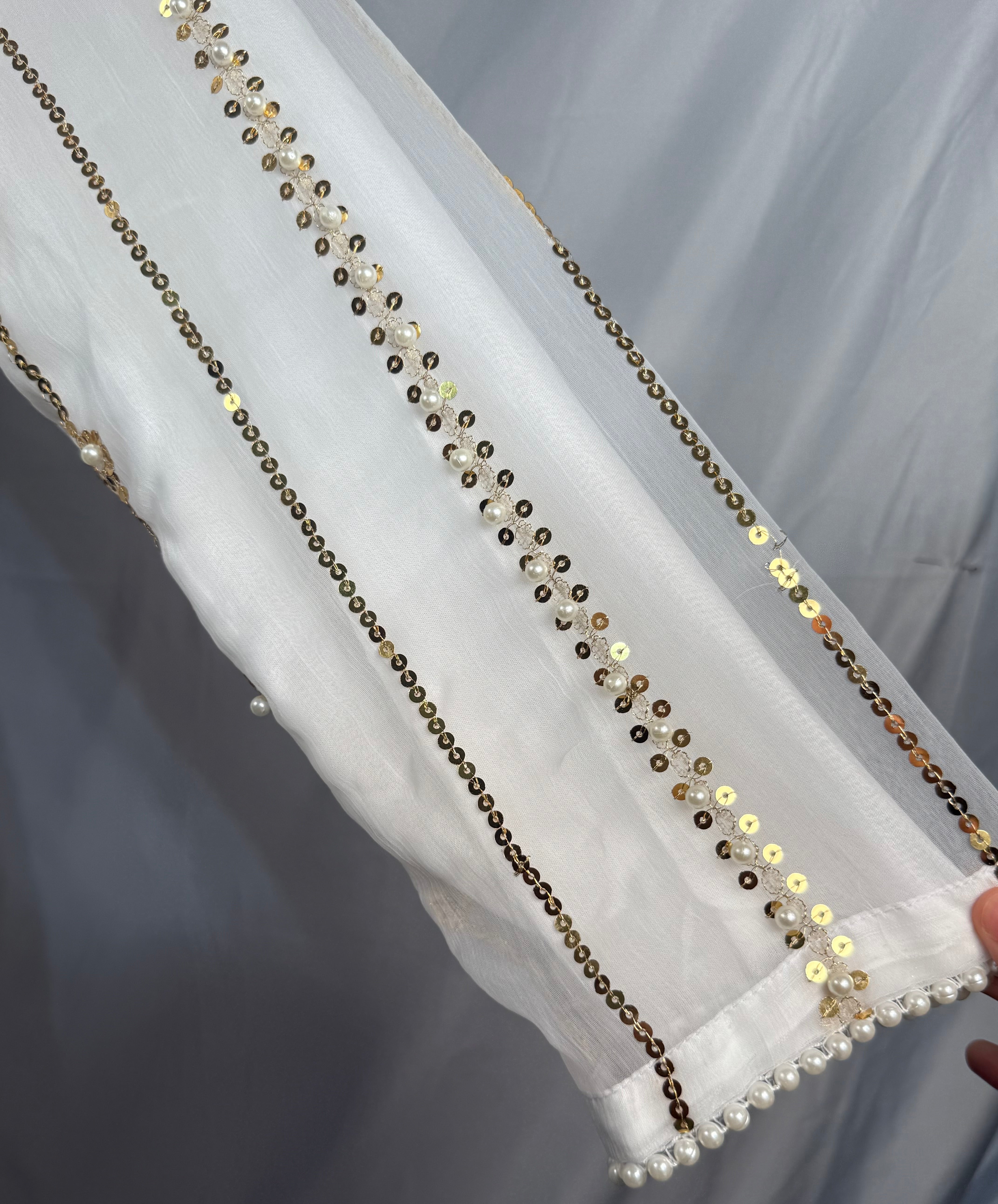 Looking for a show-stopping party suit? Then check out Nadia K from Areeba's Couture. This 3-piece suit is made from chiffon shirt, Sutton fabric Garara and dupatta and is adorned with beautiful embroidery and beads work. It's the perfect party wear for making a grand entrance and turning heads. So don't hesitate, add this party suit to your cart and get ready to be the life of the party. Crafted from high-quality materials, it ensures long-lasting durability and exceptional comfort for everyday wear.