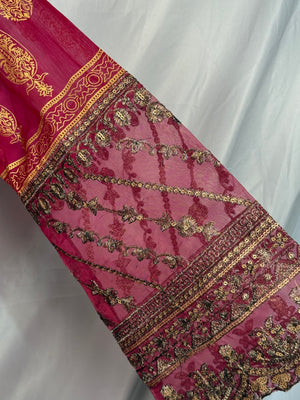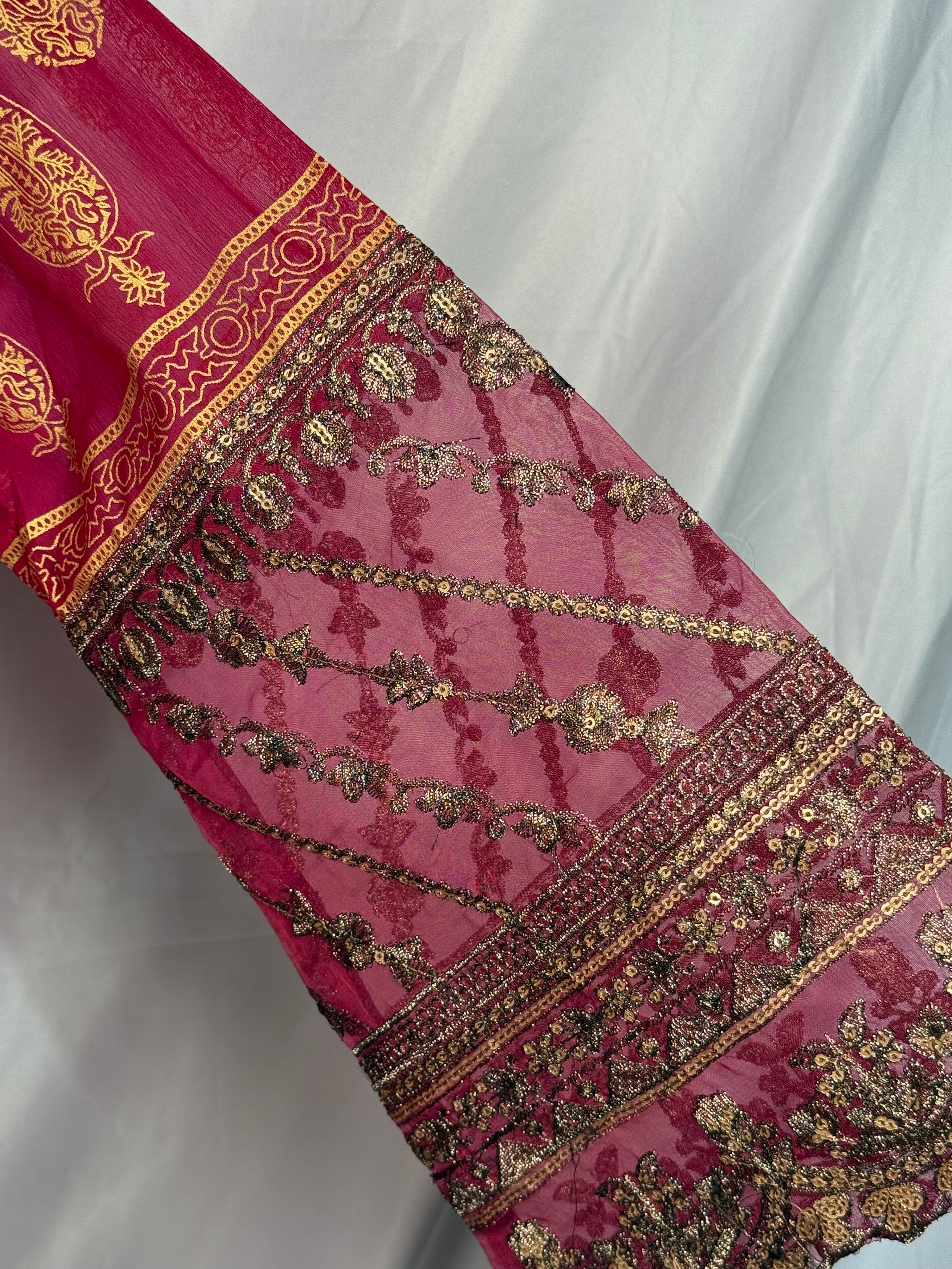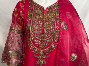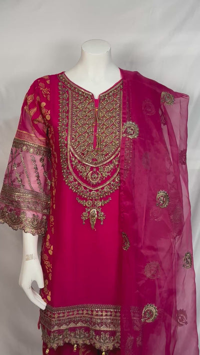 Ladies 3 Pcs Shocking Pinl Garara Set With Embroidery Chiffon Shirt Silk Cotton Garara Organza Dupatta Lgs-1